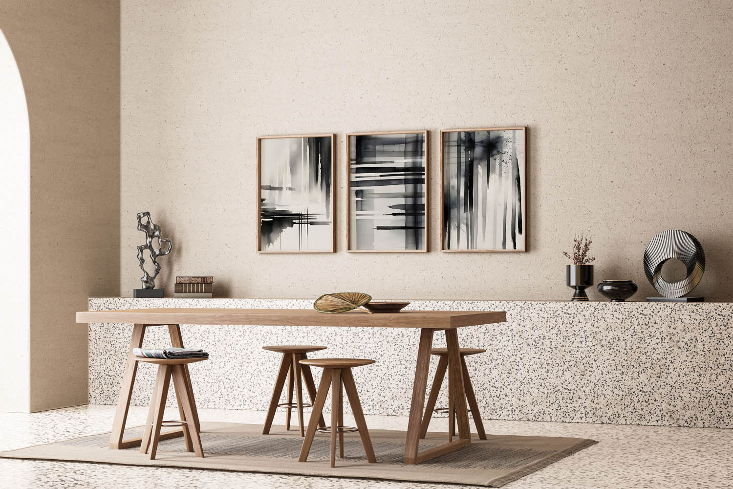- Unified art style, mixed frames: Abstract prints in different-sized frames โ works if the art is cohesive in palette