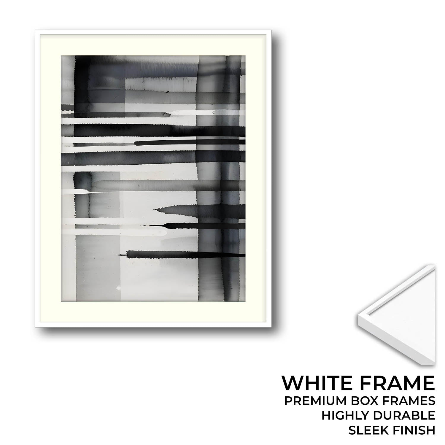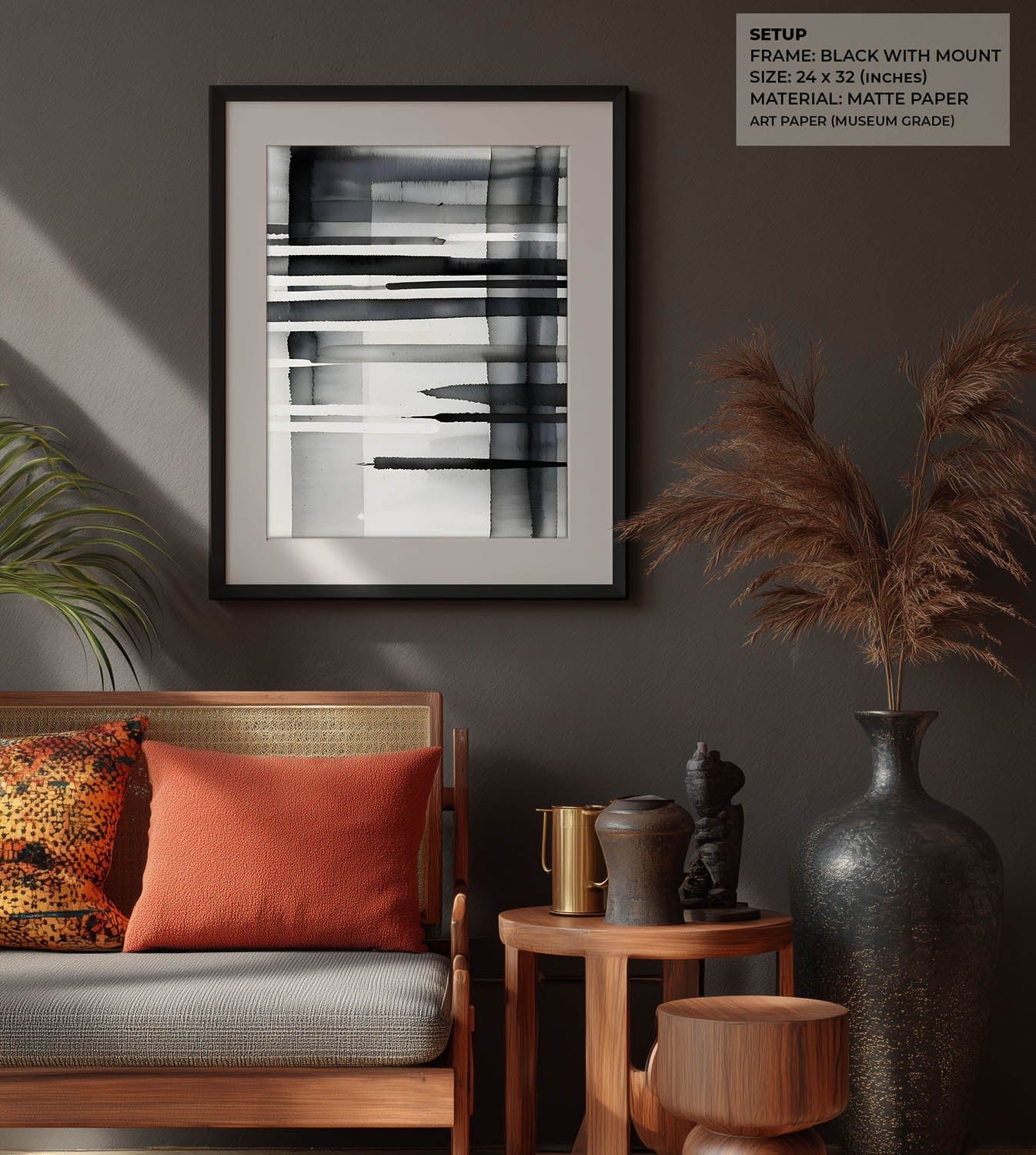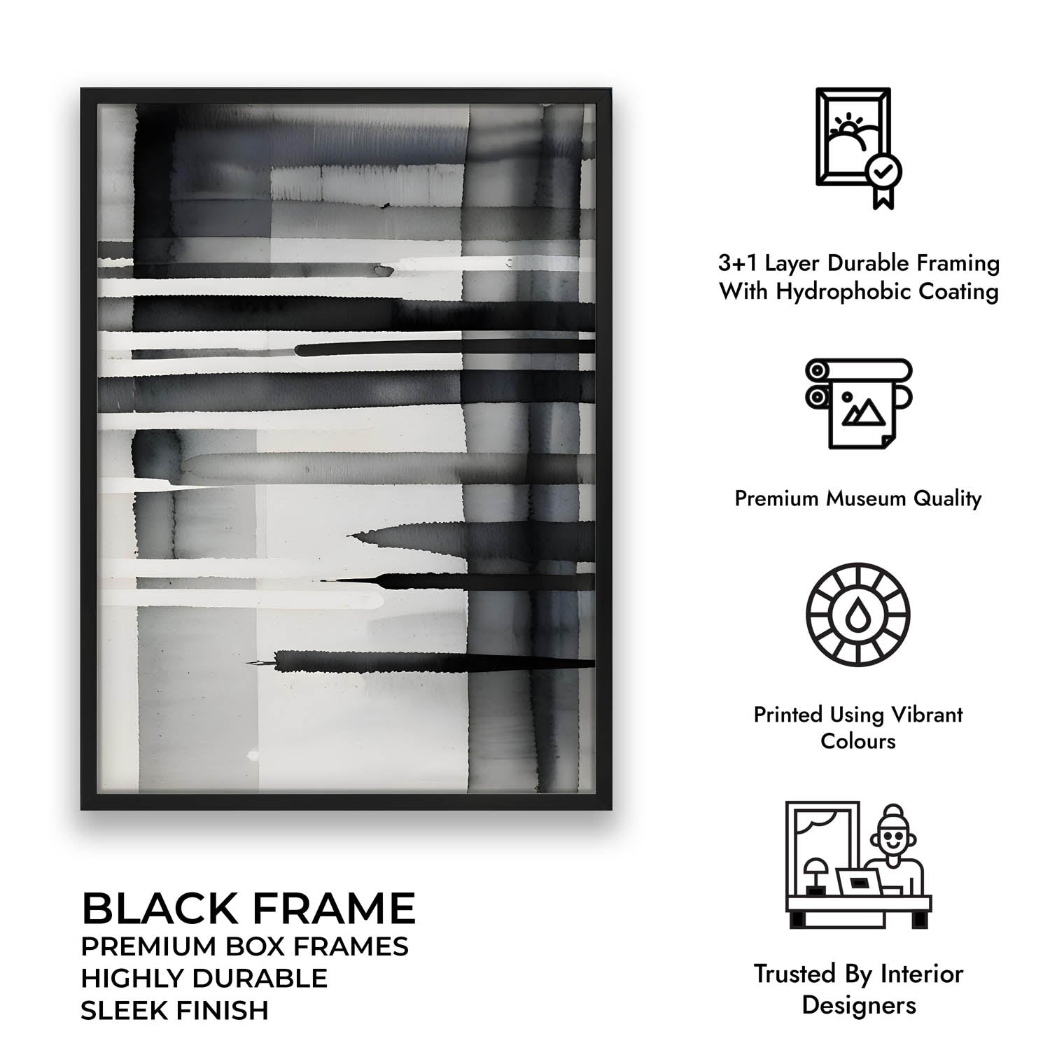 Horizontal layers of ink-like strokes create rhythm, texture, and visual tension.