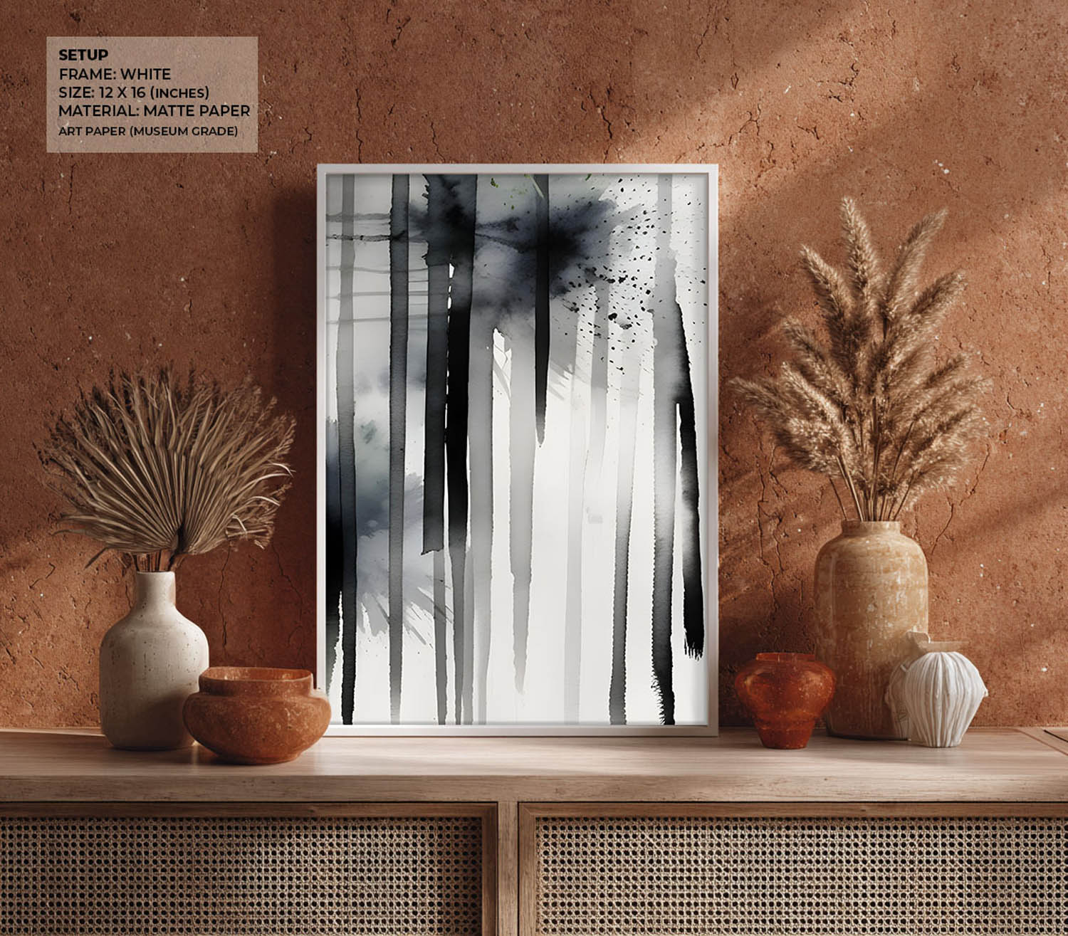 Vertical ink drips and soft washes create a moody, atmospheric abstract landscape.
