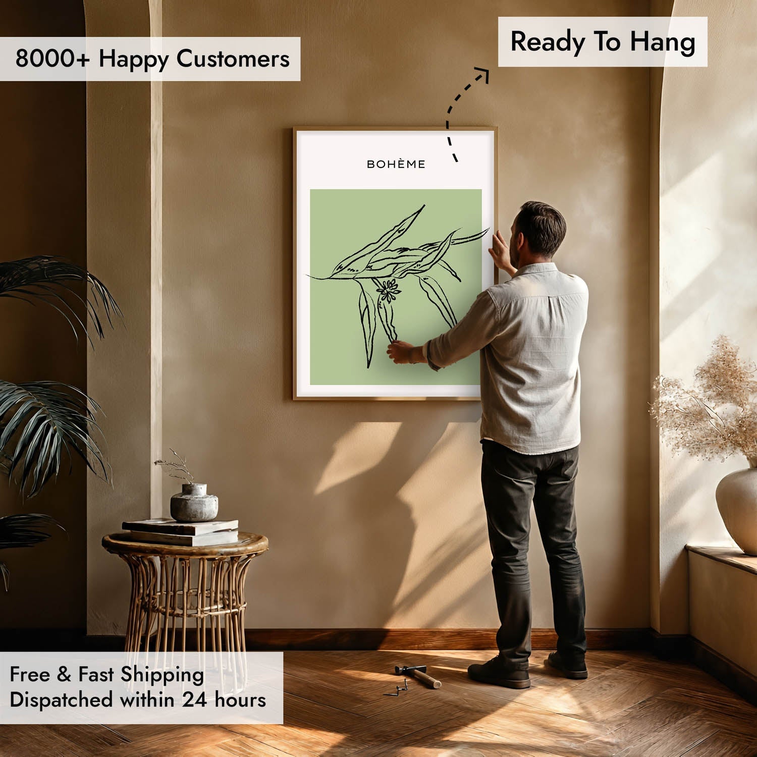 Only our framed art prints come Ready To Hang (RTH). Which means that when you shop art from us, be rest assured that it comes with high-quality hooks already equipped in the back board. So once you receive your art you just need to hang it on your favorite nook.