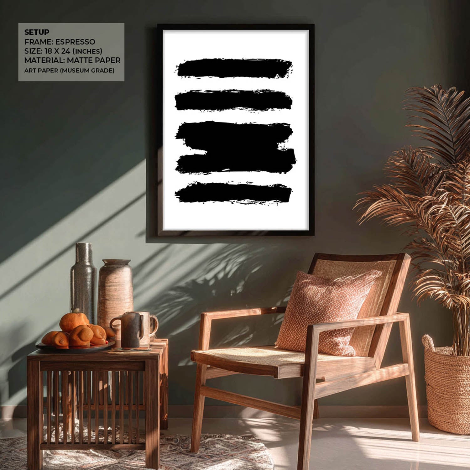 Bold horizontal brush strokes cut through a clean white canvas, creating rhythm through raw simplicity.