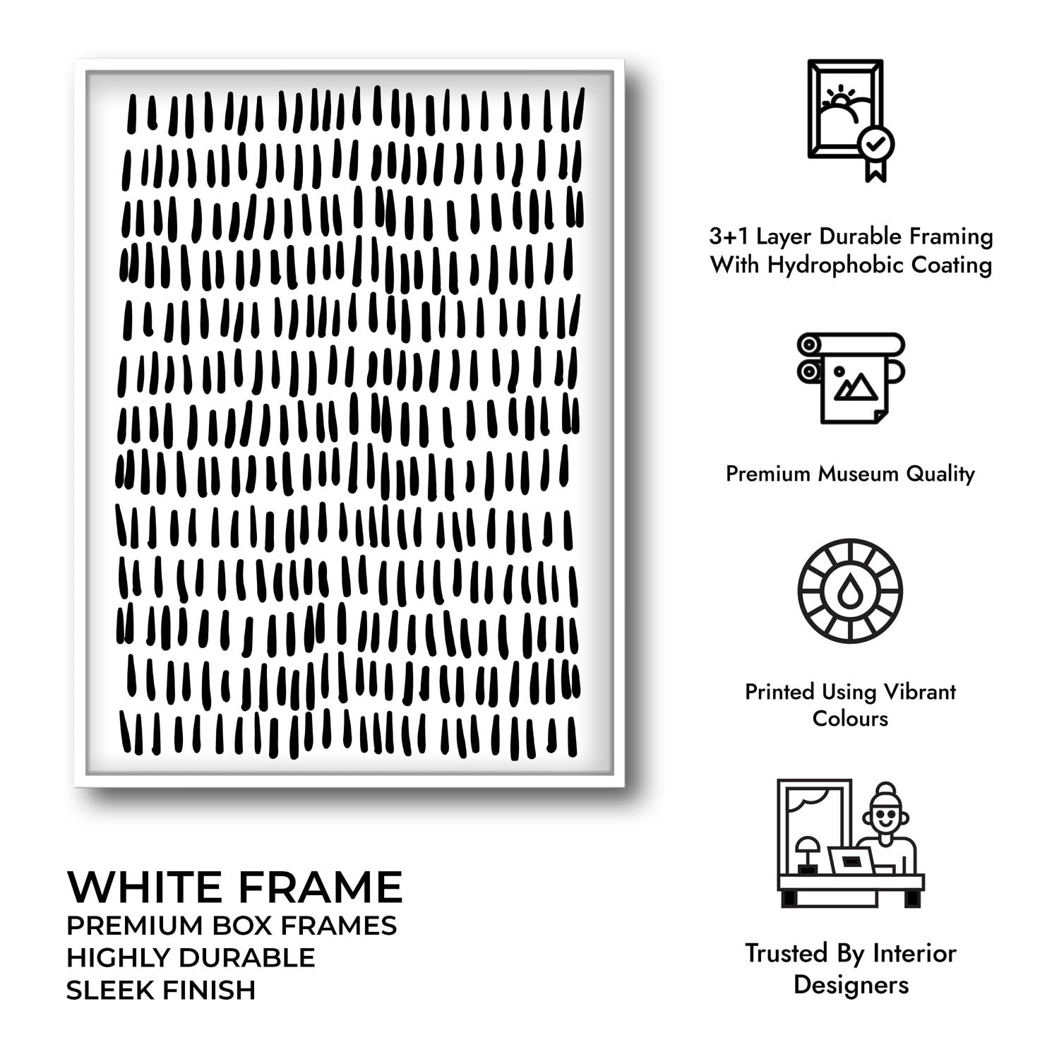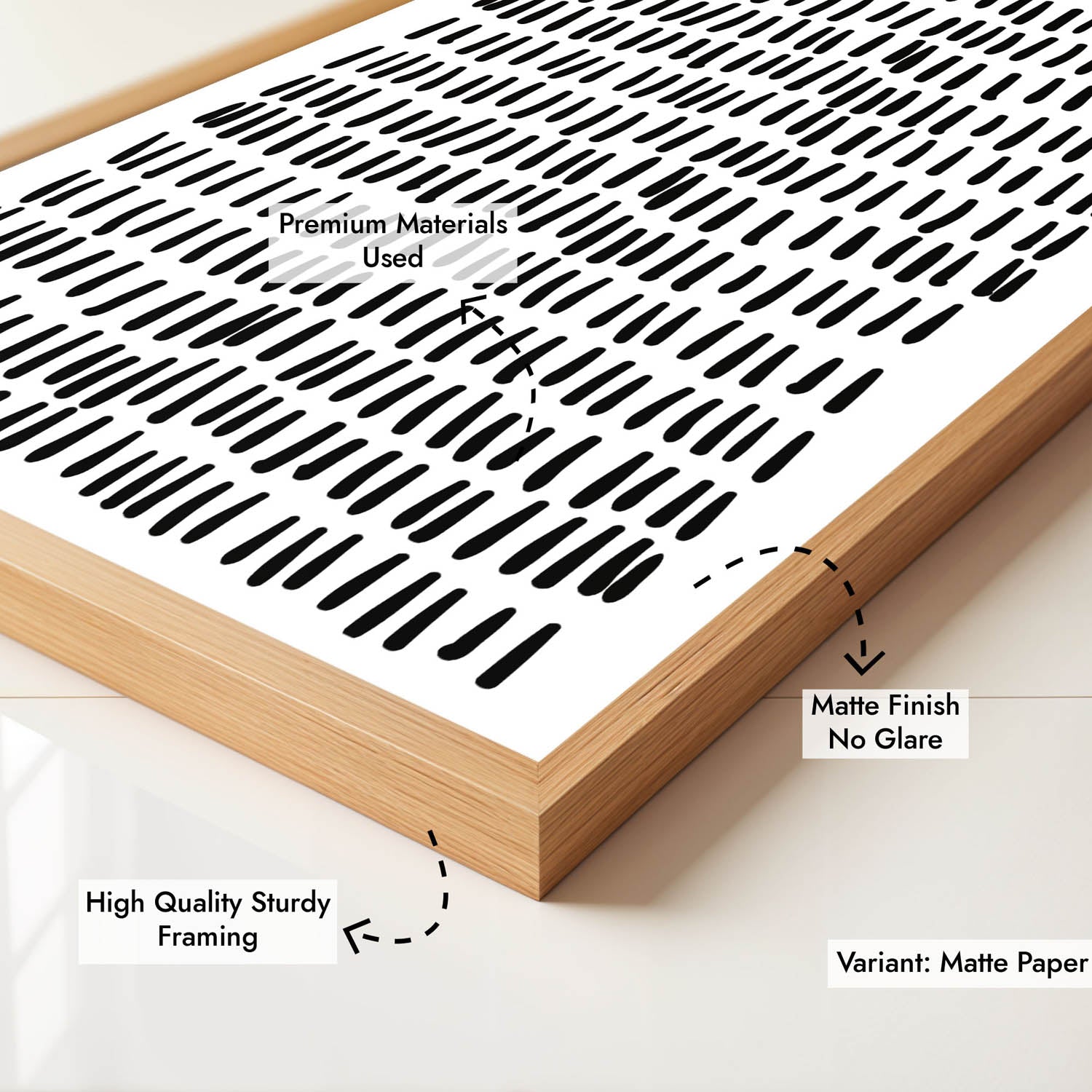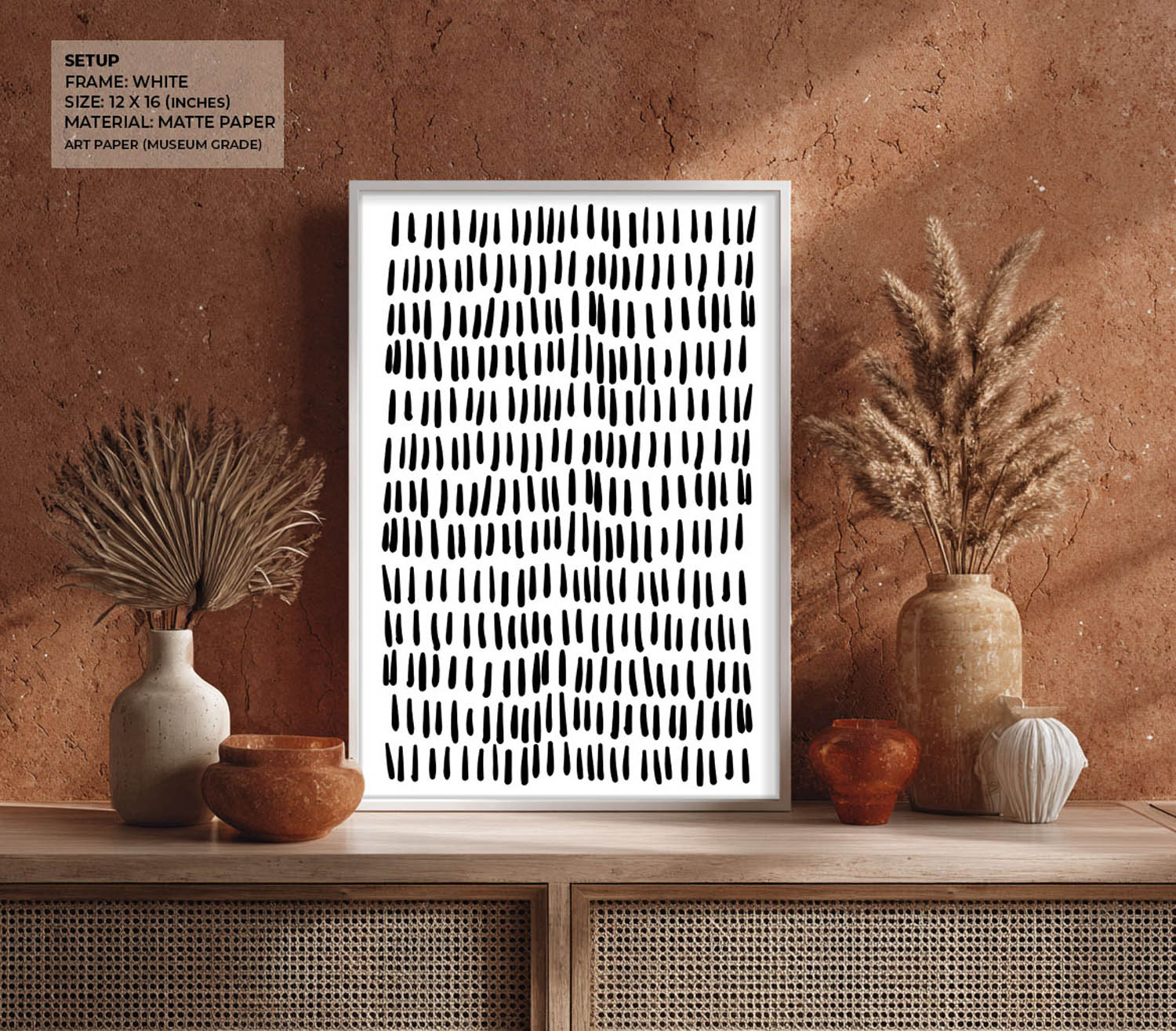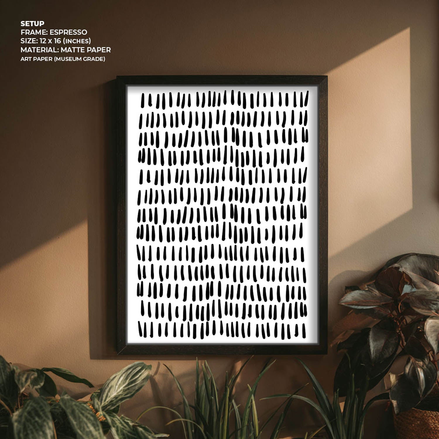 A soft, rhythmic abstract made of repeated black strokes, evoking gentle rain on a quiet day.