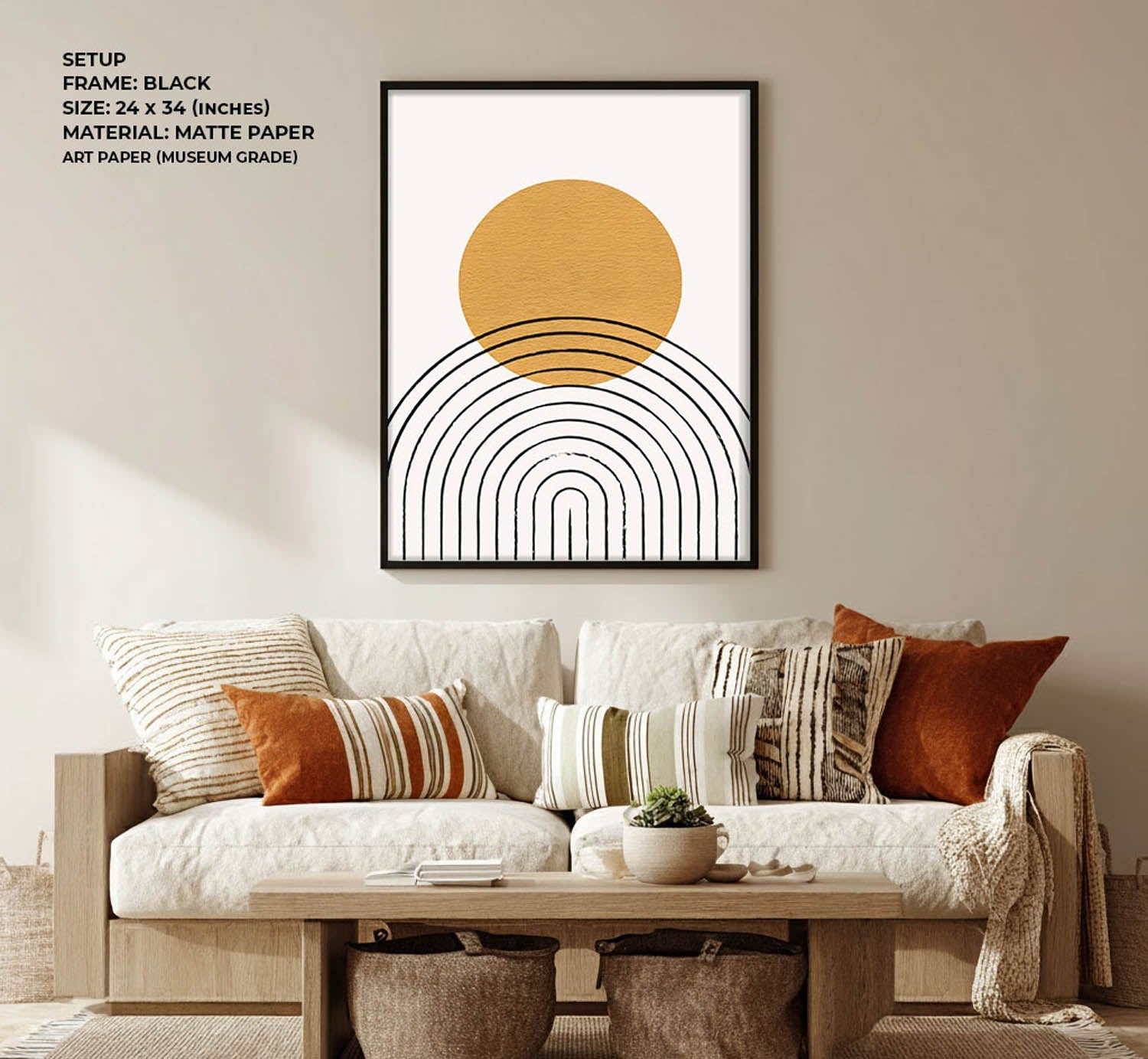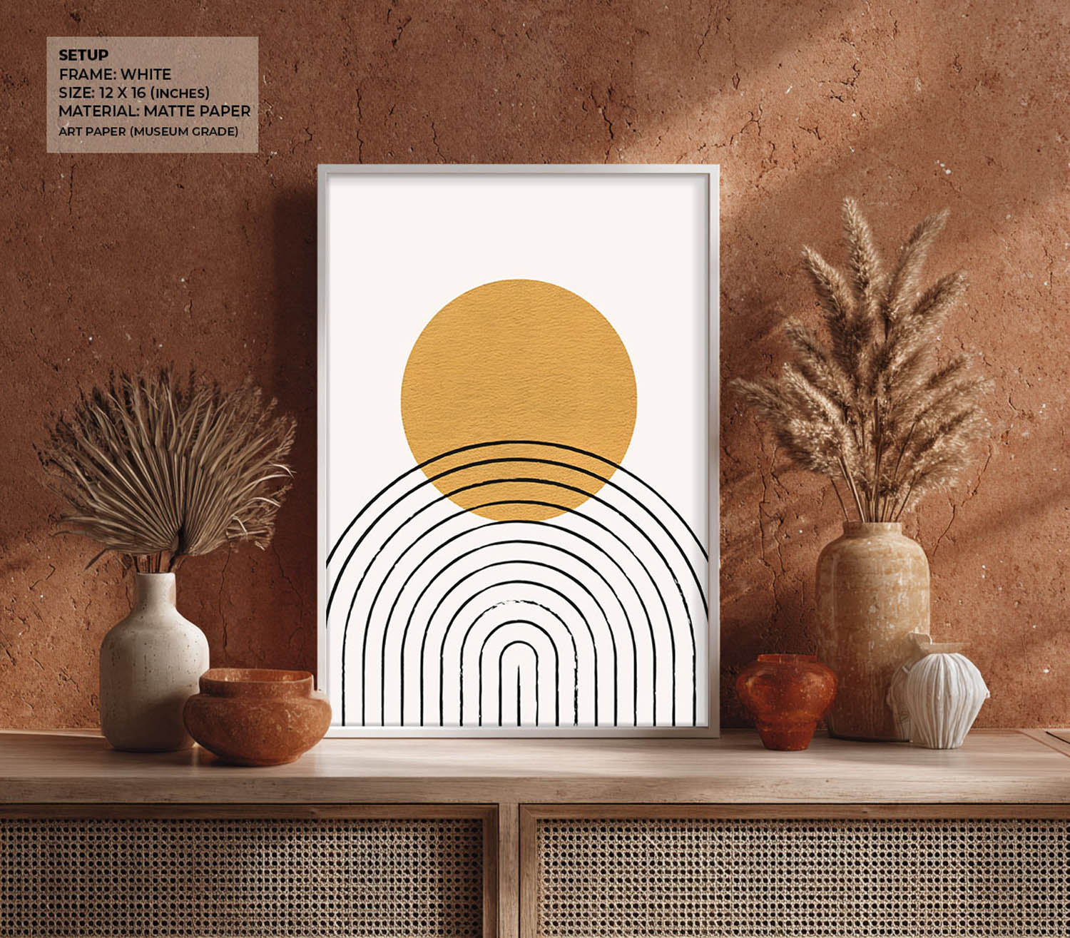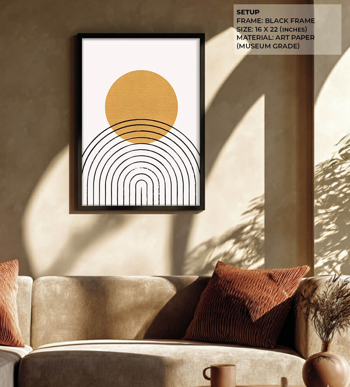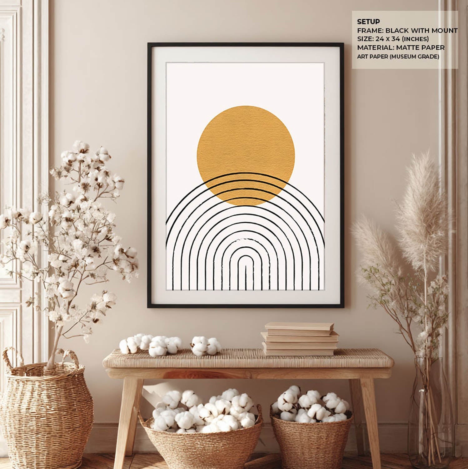 Horizon evokes a golden sunrise rising above rhythmic arches, symbolizing new beginnings and grounded optimism. A clean, modern statement piece perfect for boho and minimal interiors alike.