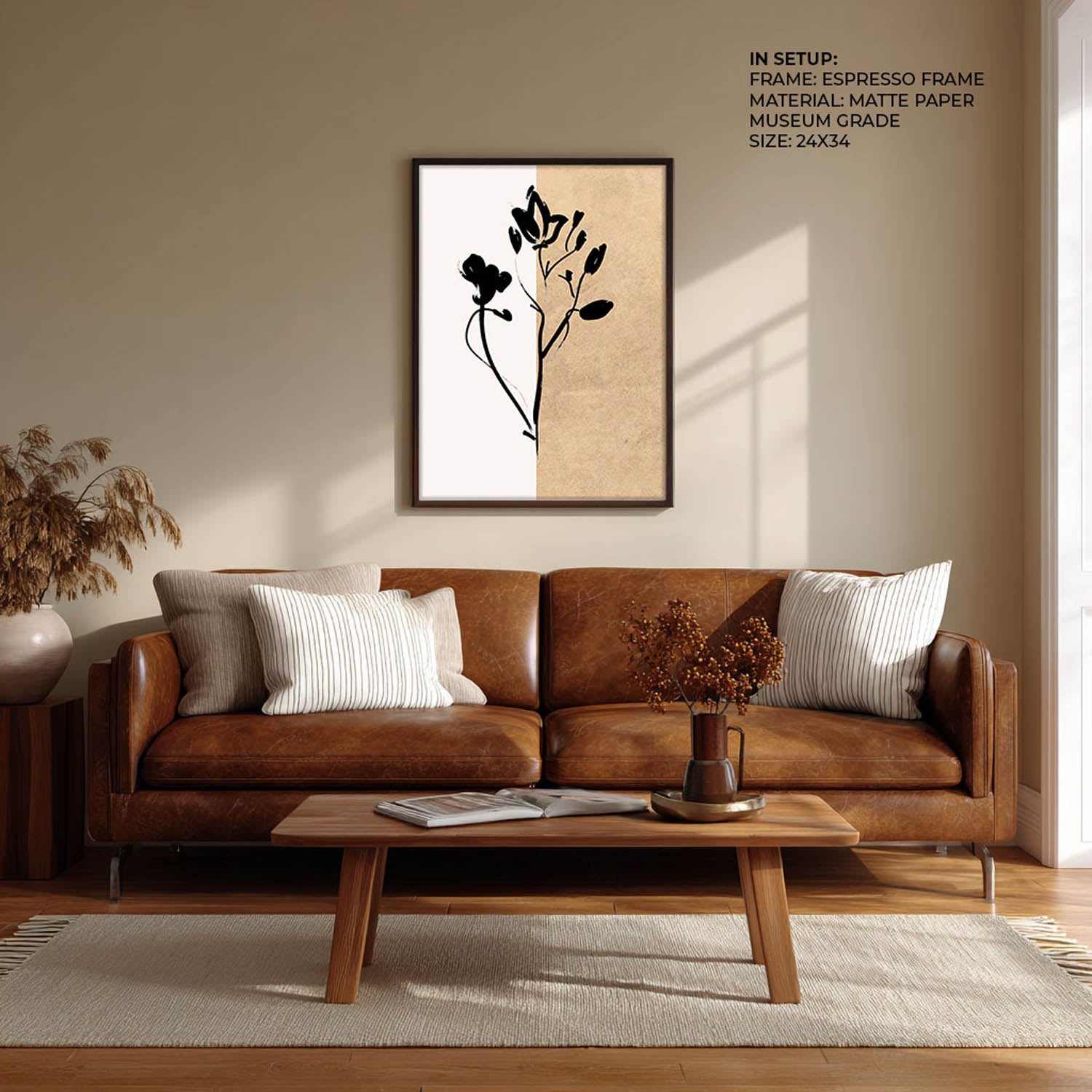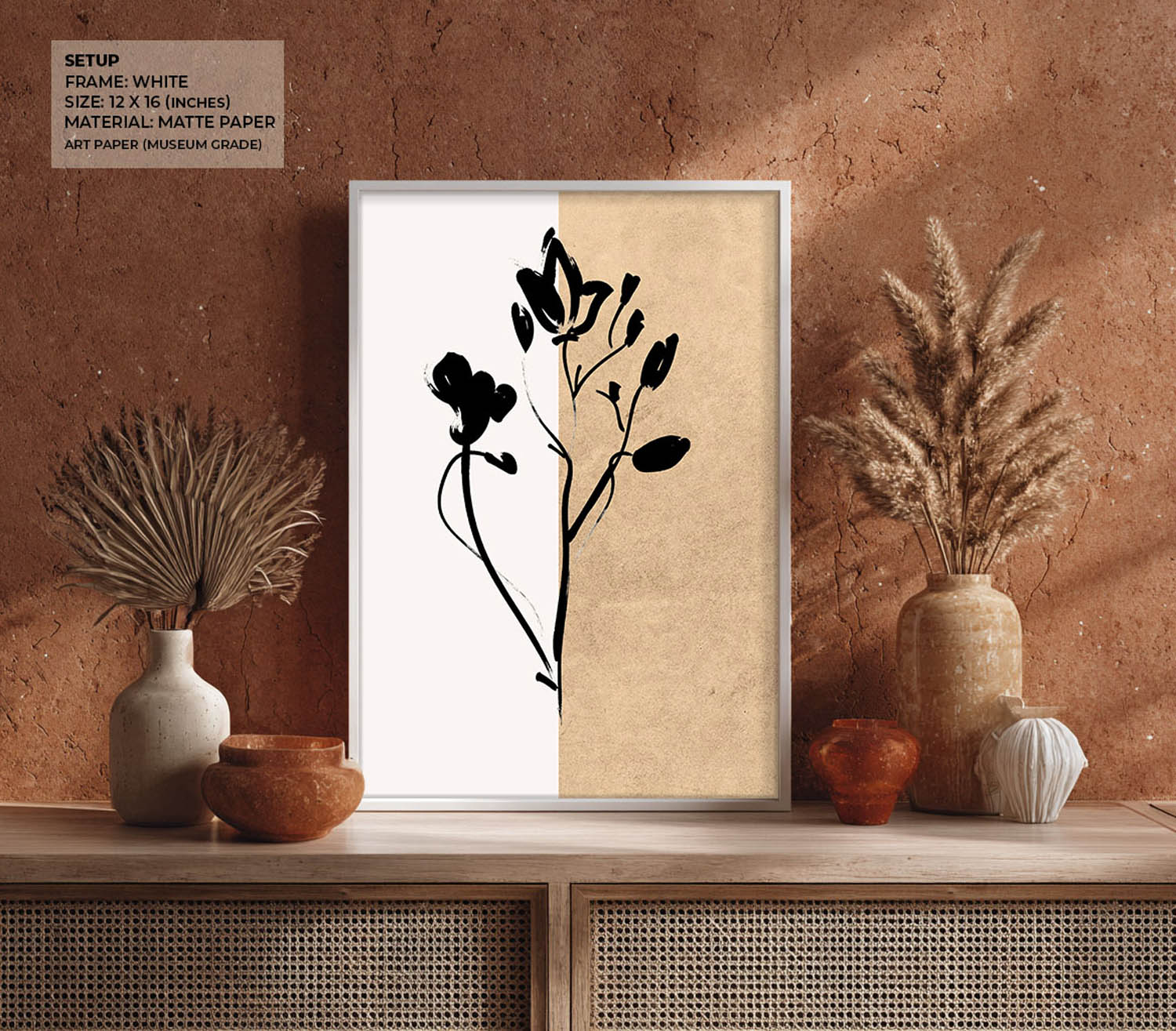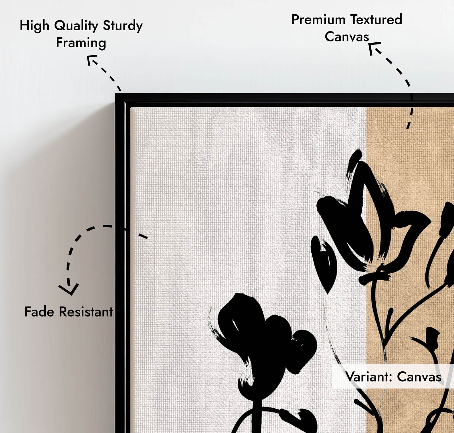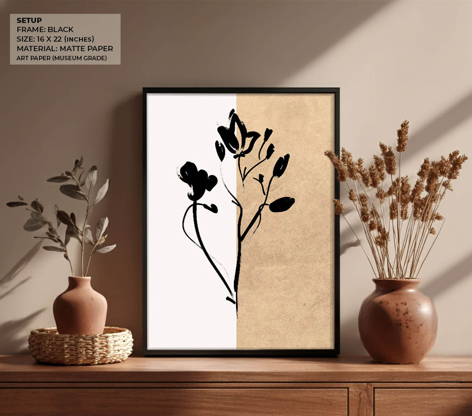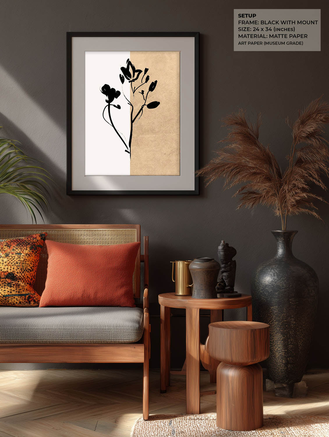 Bring home the quiet beauty of Midnight Flower, where a delicate floral silhouette in black blooms across a two-toned background, blending nature with soft minimalism.