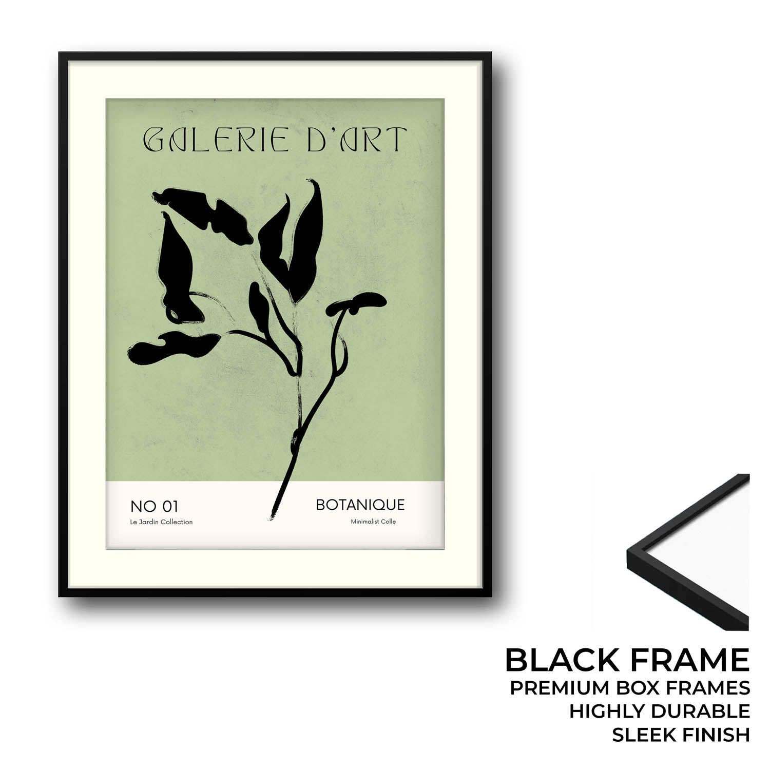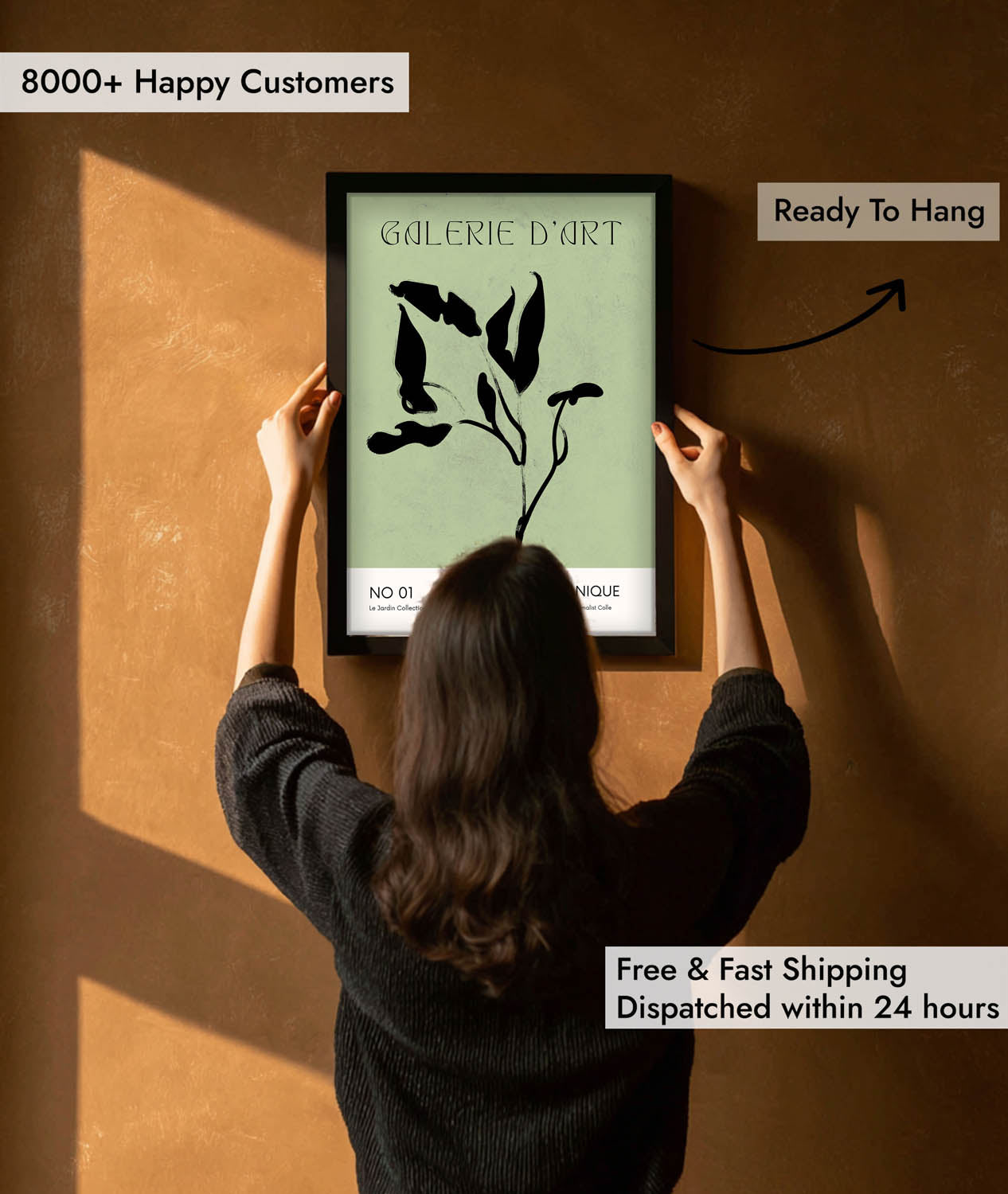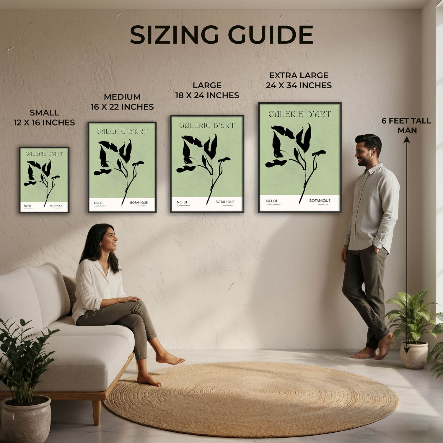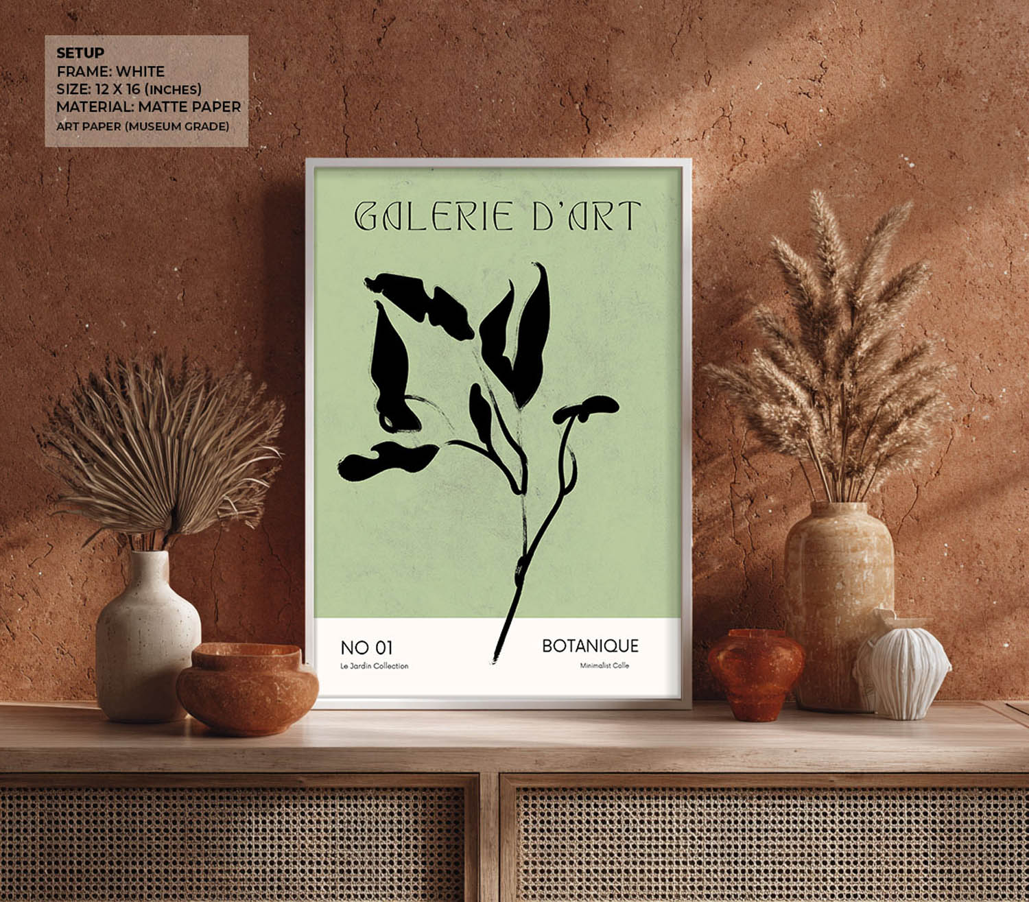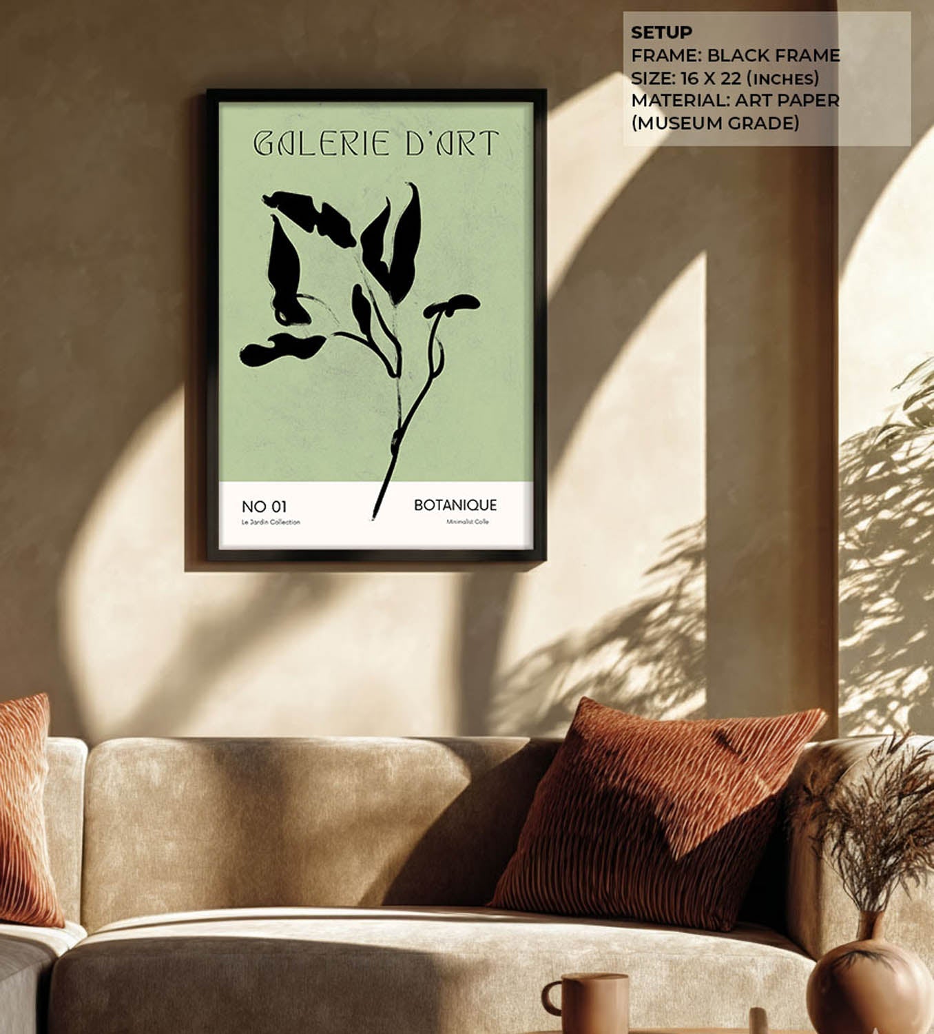 Verdant Elegance celebrates nature’s simplicity in its most graceful form. With bold, black botanical silhouettes on a soft sage backdrop, this artwork whispers the poetry of leaves and light.