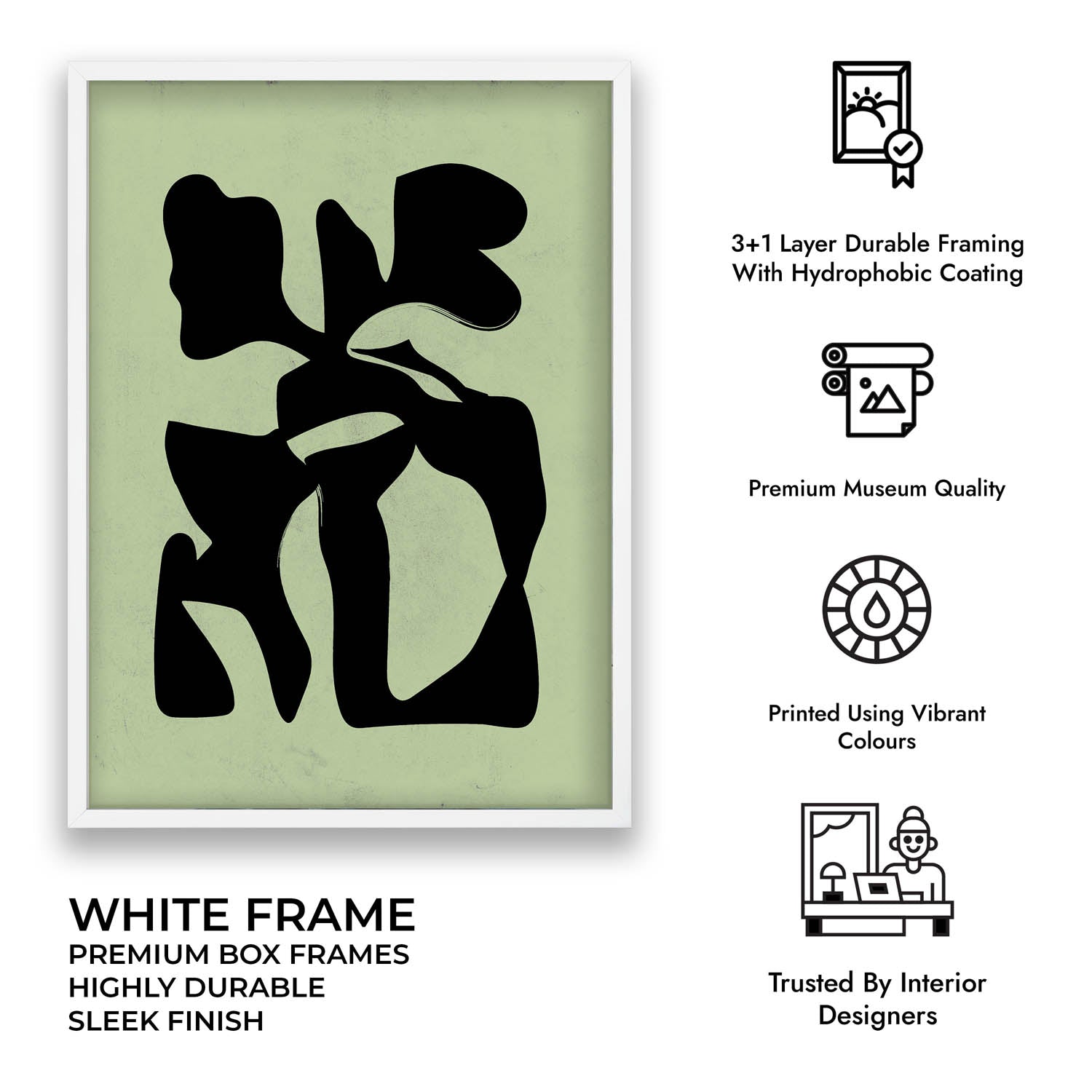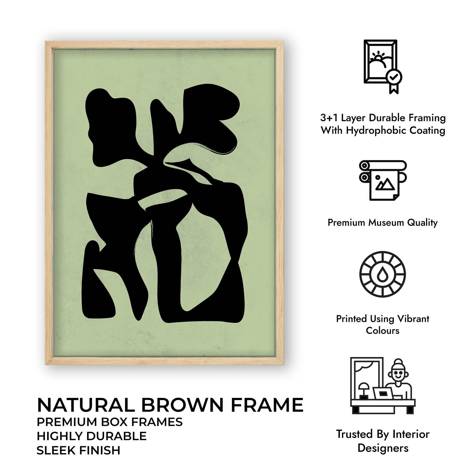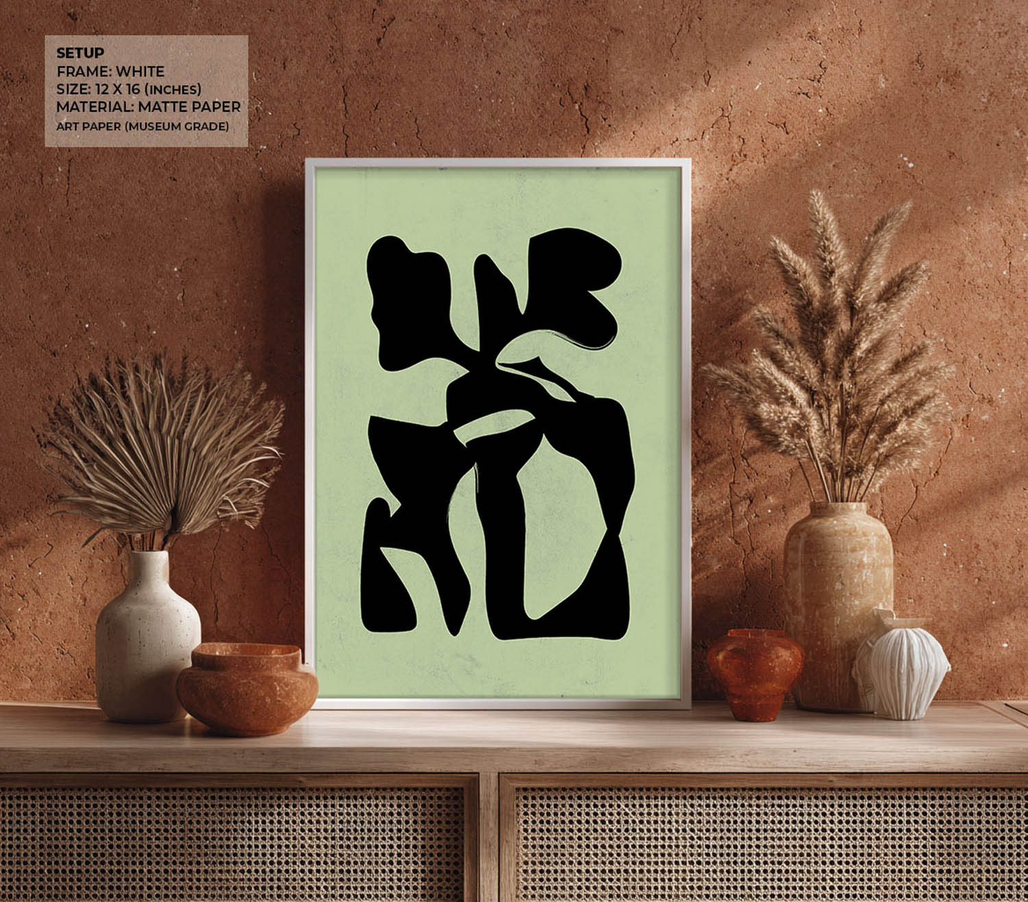 Abstract Harmony is a dance of flowing black shapes across a serene sage backdrop—capturing the delicate balance between chaos and calm in a single, striking visual.