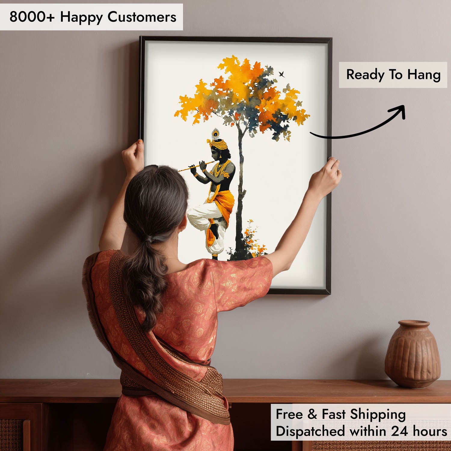 Bring home divine peace with this beautiful Krishna painting, showing Lord Krishna standing under a blooming tree, playing his flute. The artwork radiates calmness, devotion, and joy — making it perfect for living rooms, meditation corners, or home temples. According to Vastu, a Krishna wall art attracts love, positivity, and harmony into your home.
