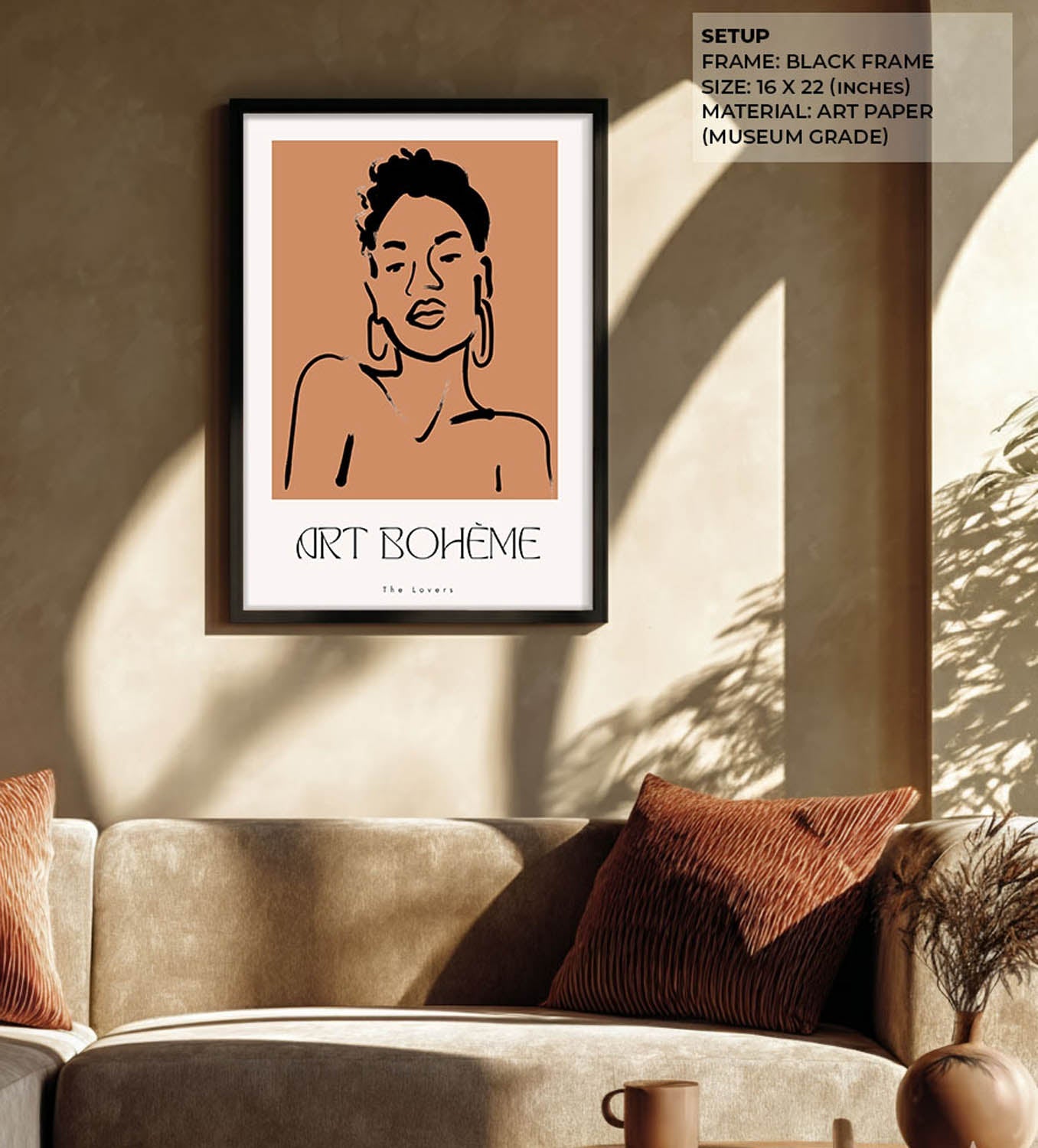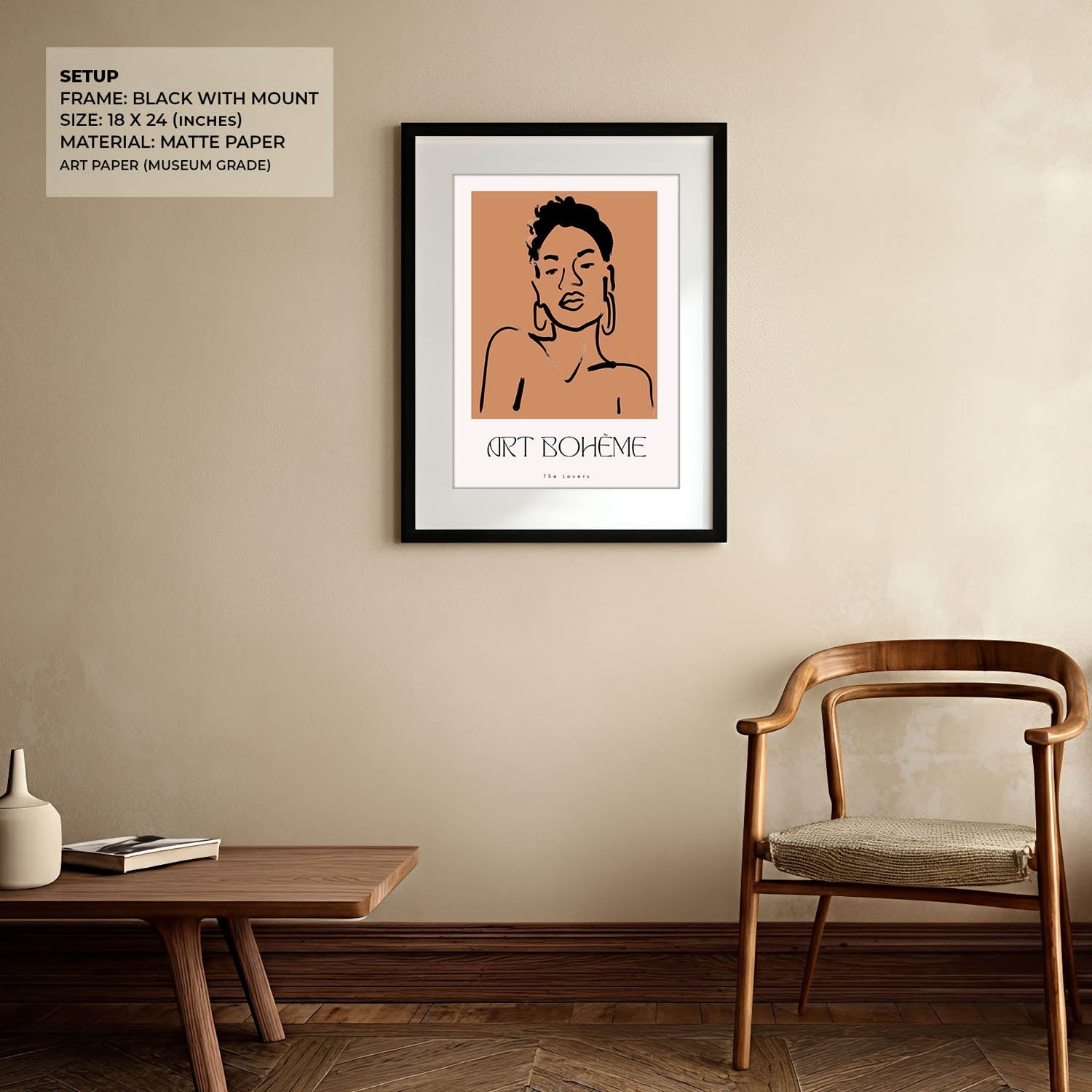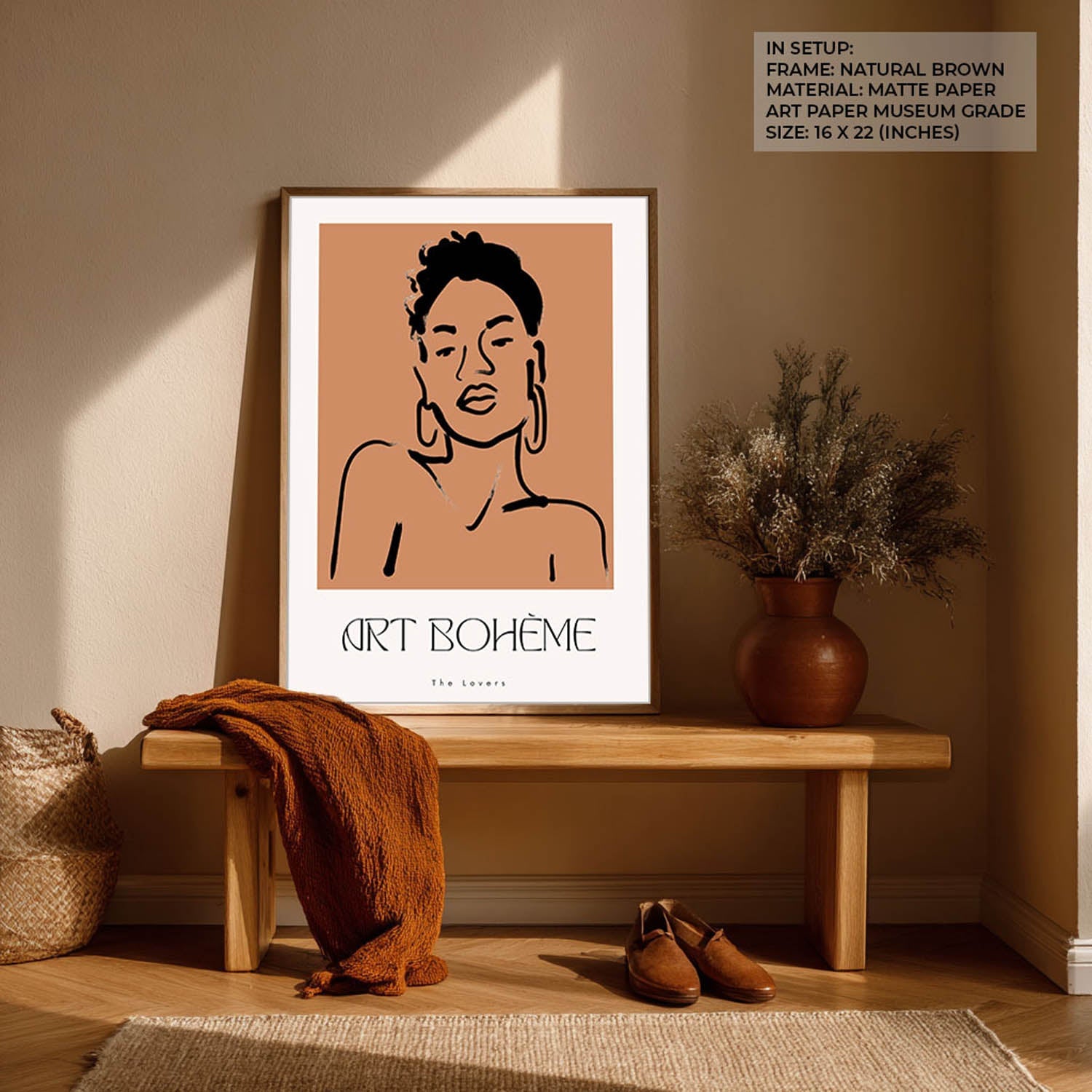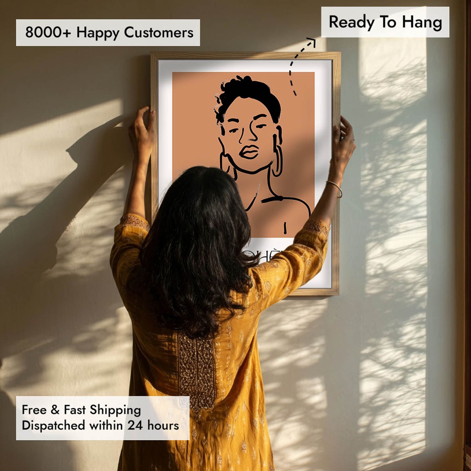 Celebrate feminine strength with Forza Delicata, a bold black-line portrait set against a warm, earthy tone—capturing power and poise in the simplest of strokes.