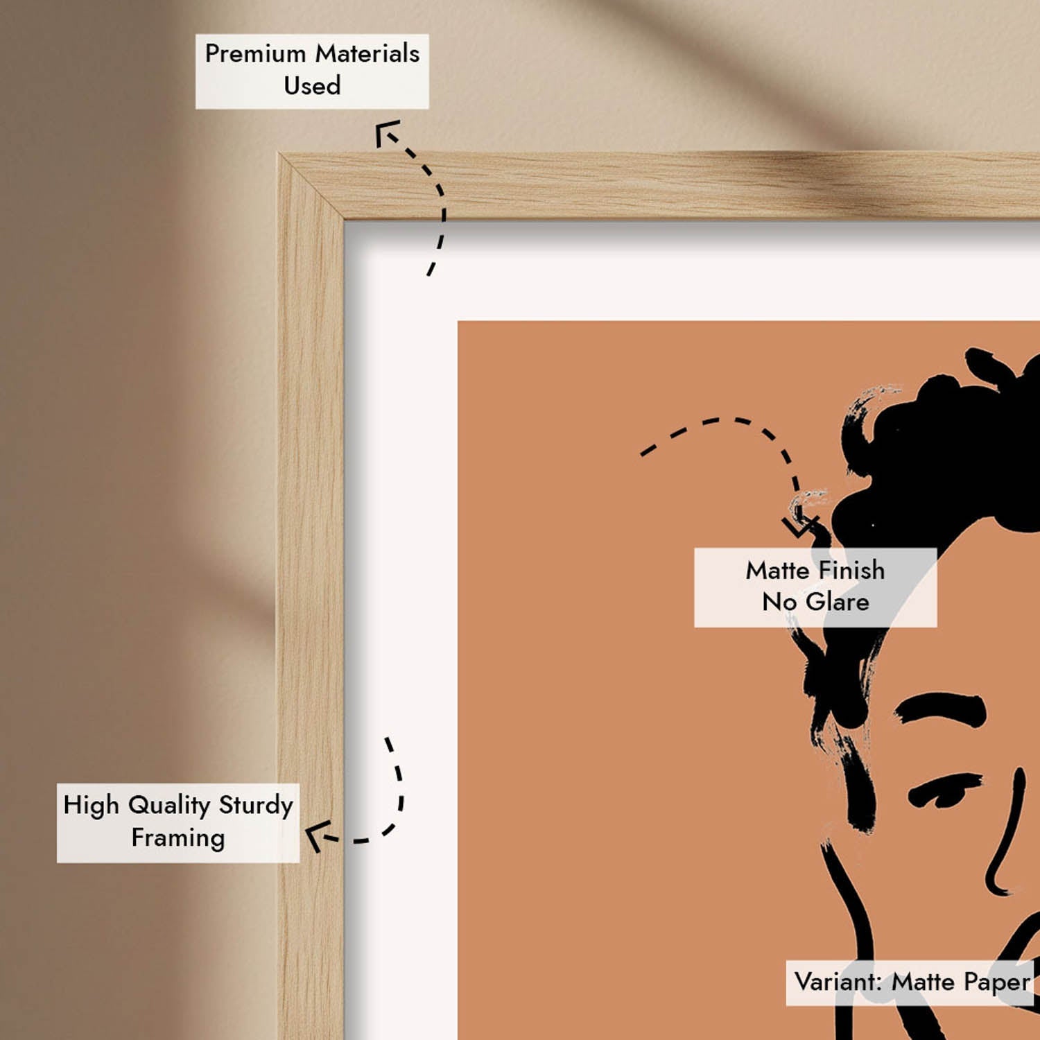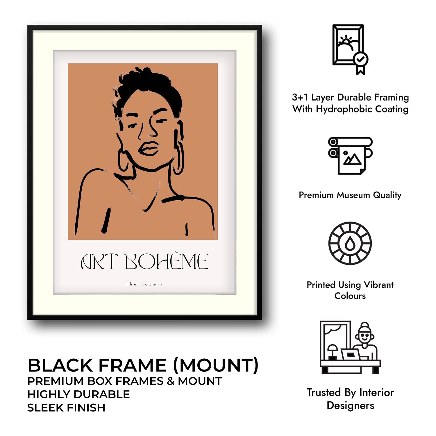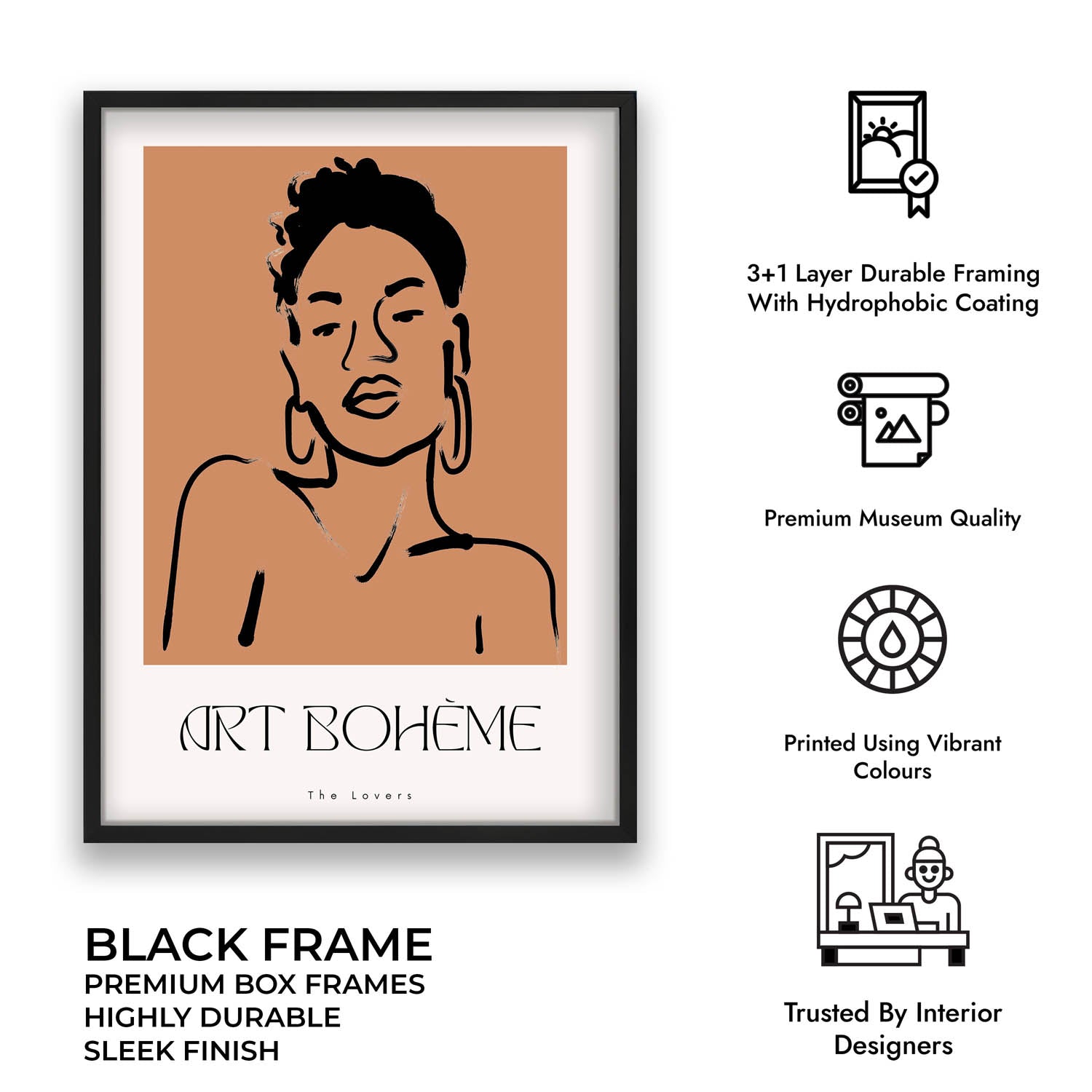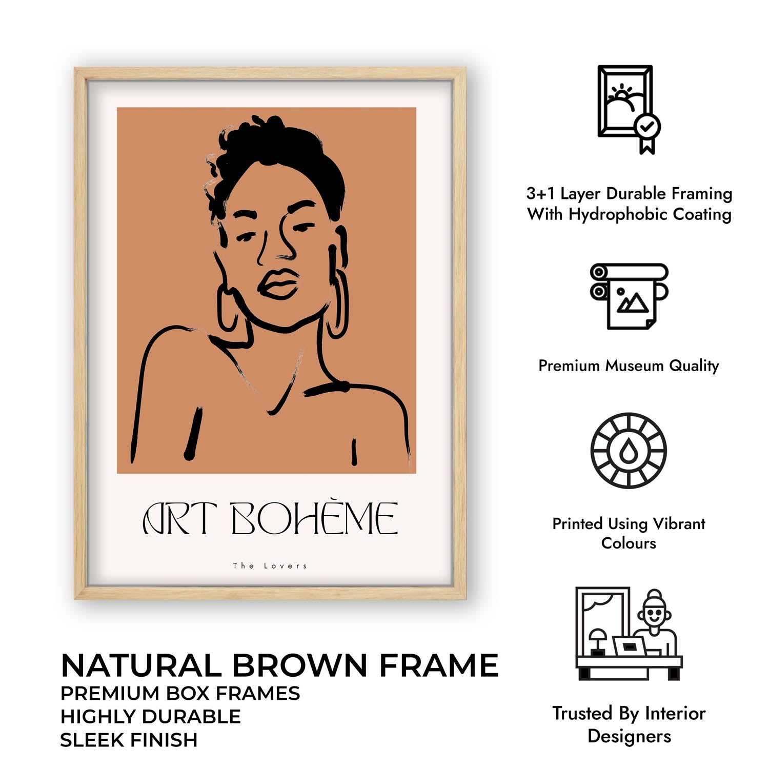 Celebrate feminine strength with Forza Delicata, a bold black-line portrait set against a warm, earthy tone—capturing power and poise in the simplest of strokes.