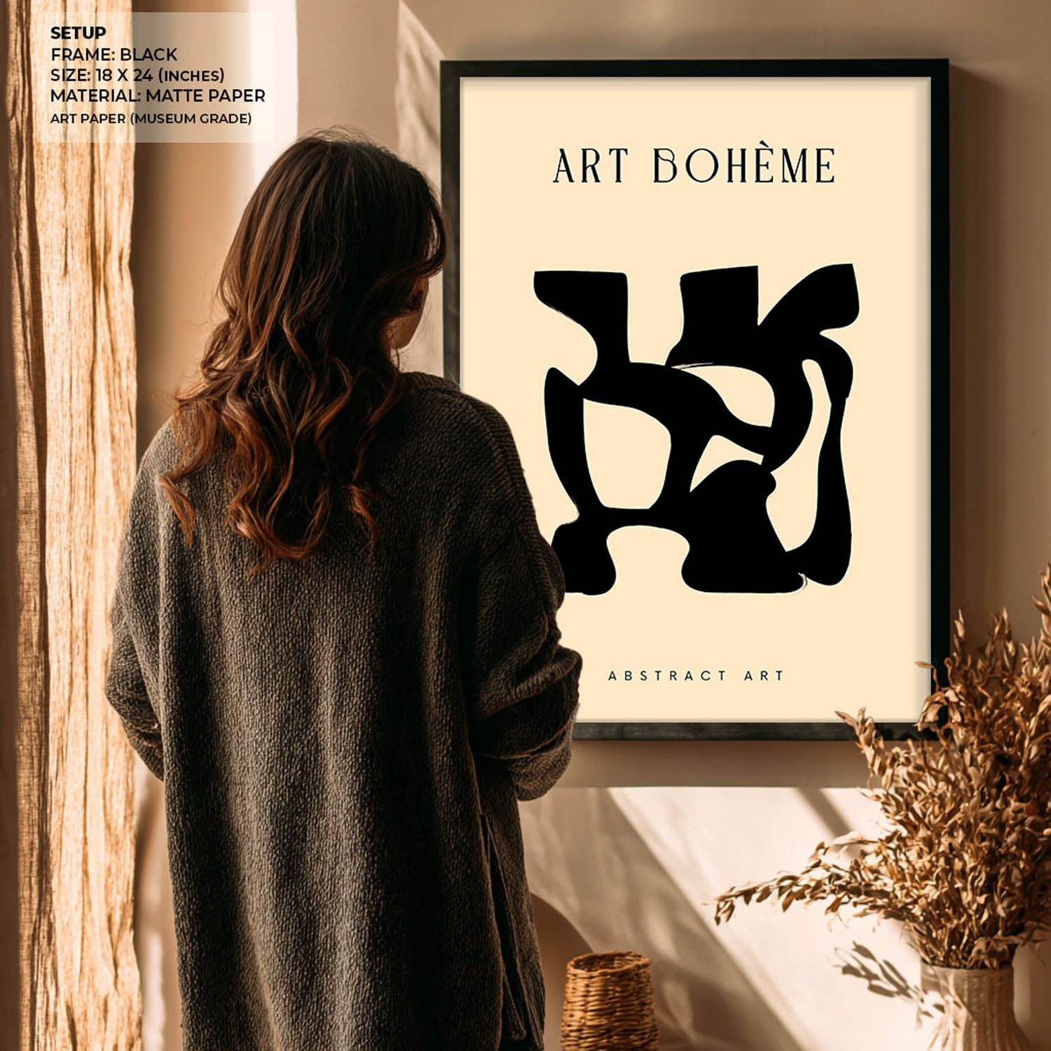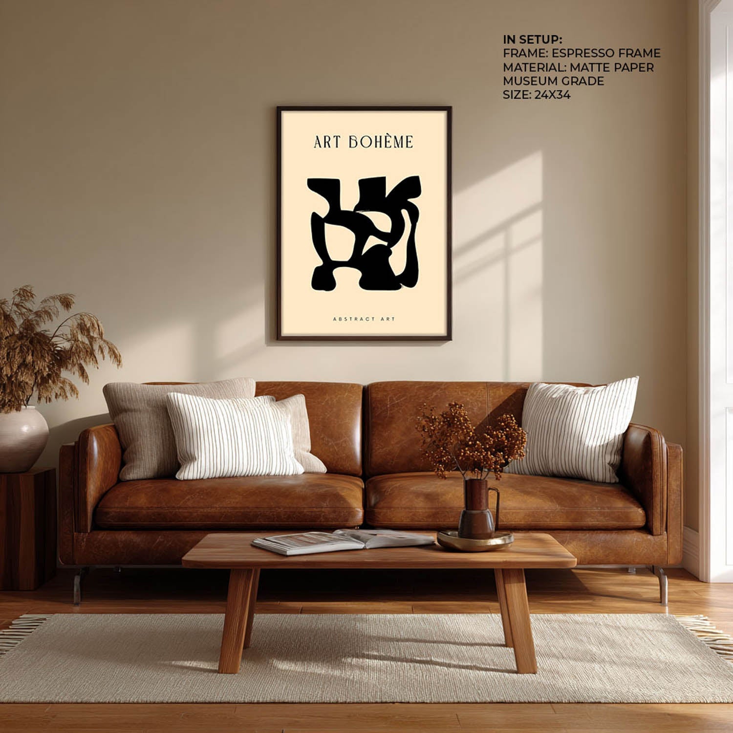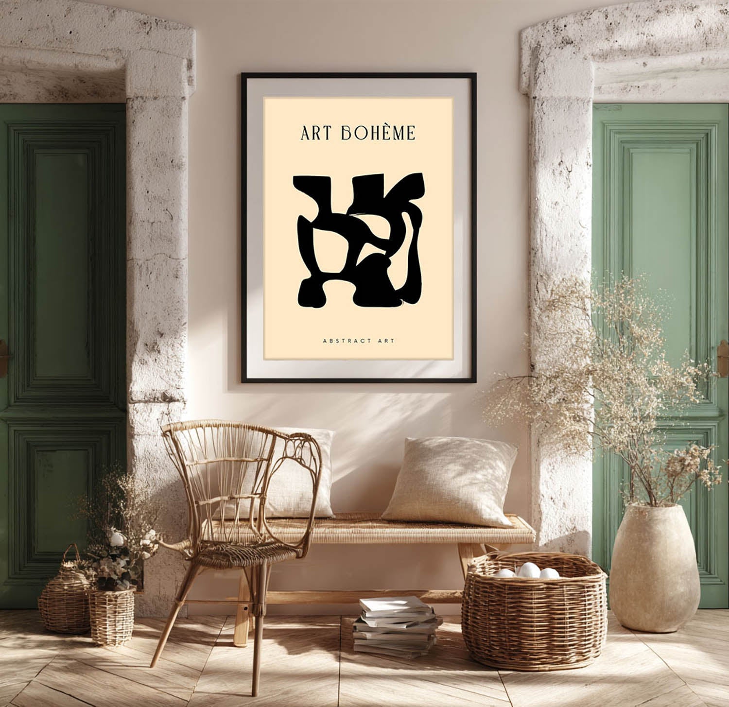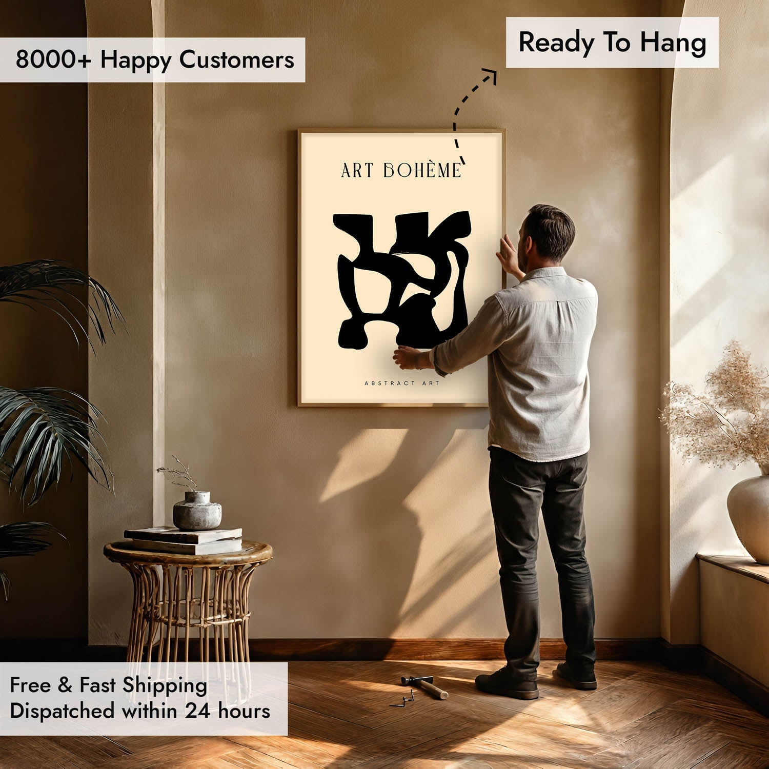 Discover the creative charm of Dream Tapestry, where bold black forms dance across a soft beige canvas, celebrating free expression and abstract style.