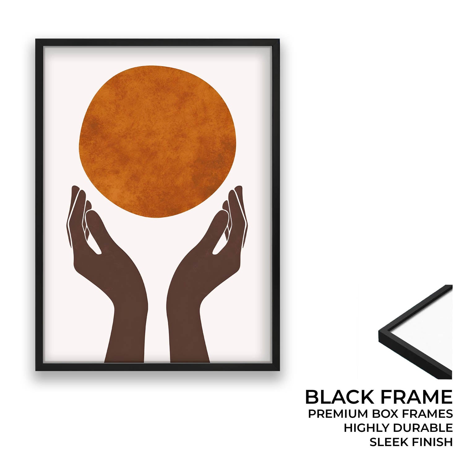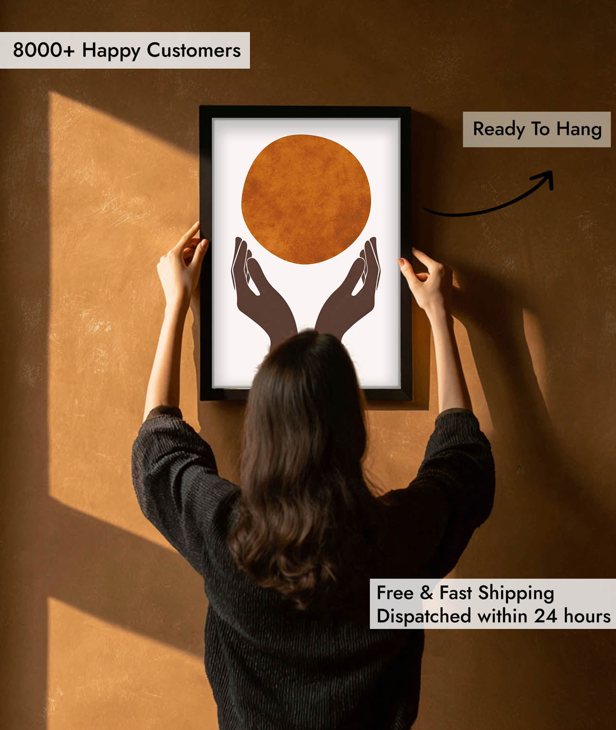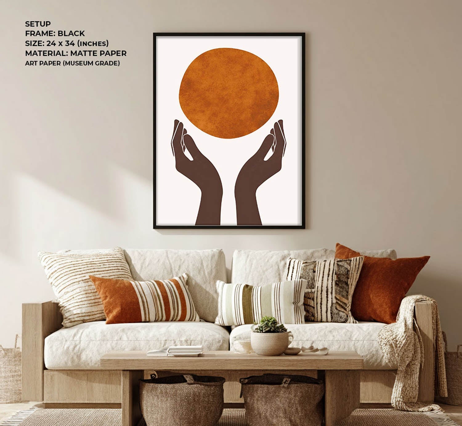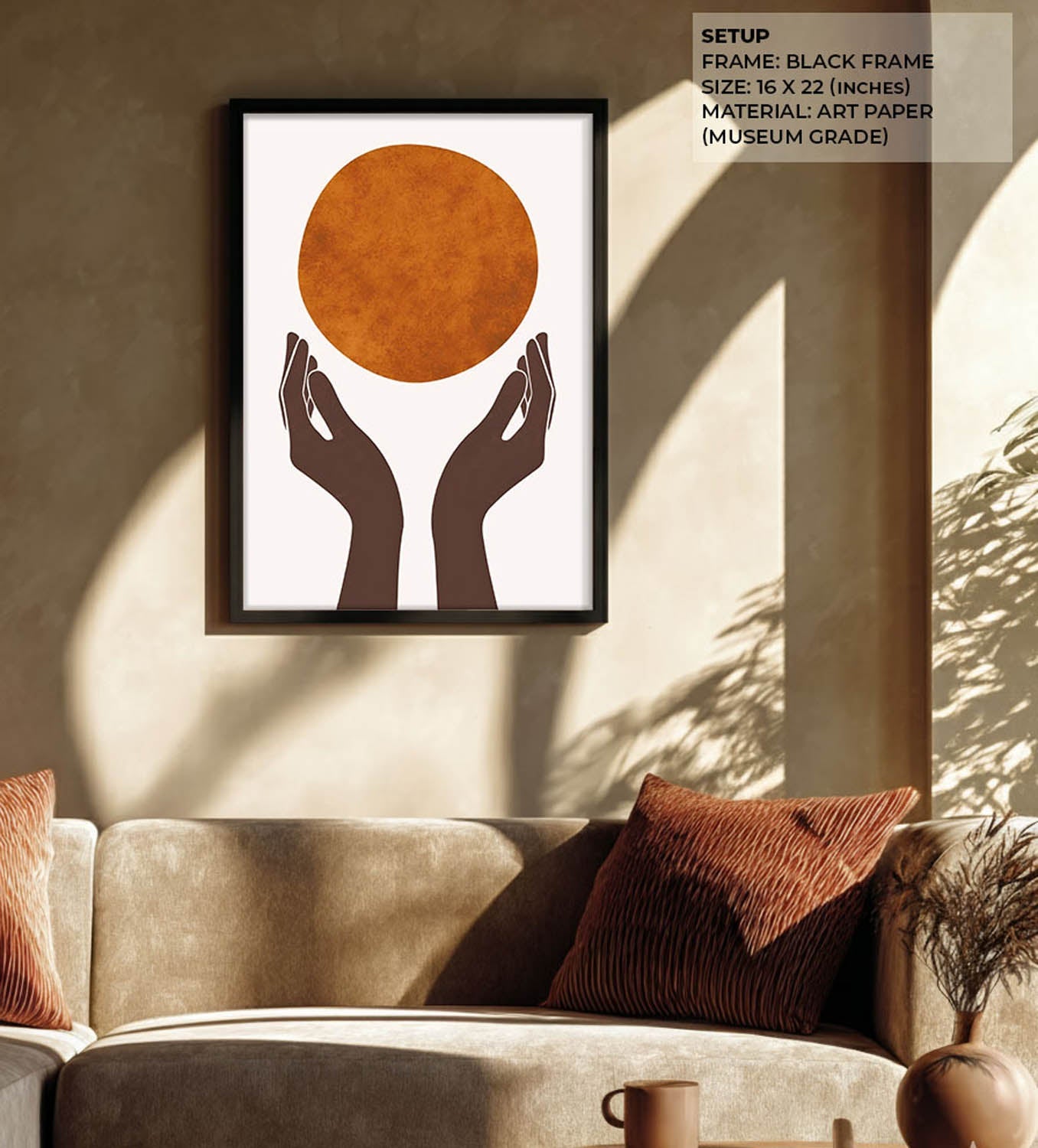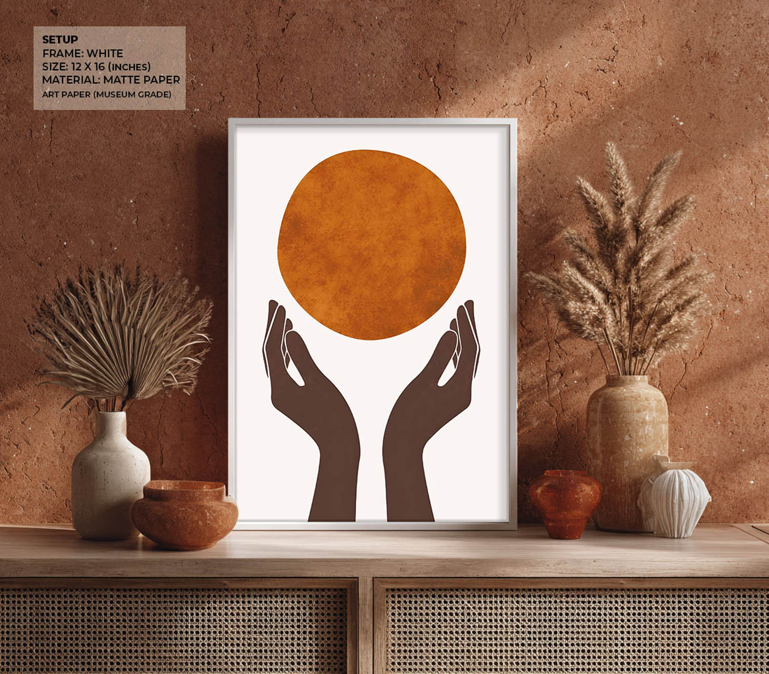 Harmony evokes balance and reverence with two graceful hands lifting a radiant sun-like orb. This minimalist design speaks of inner peace, grounding energy, and the quiet strength of stillness—ideal for meditative and soulful spaces.