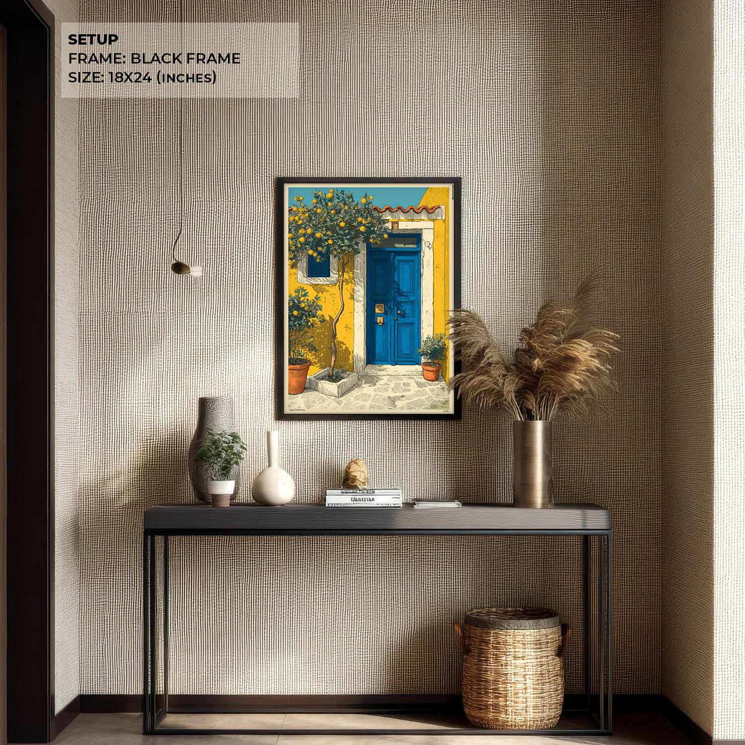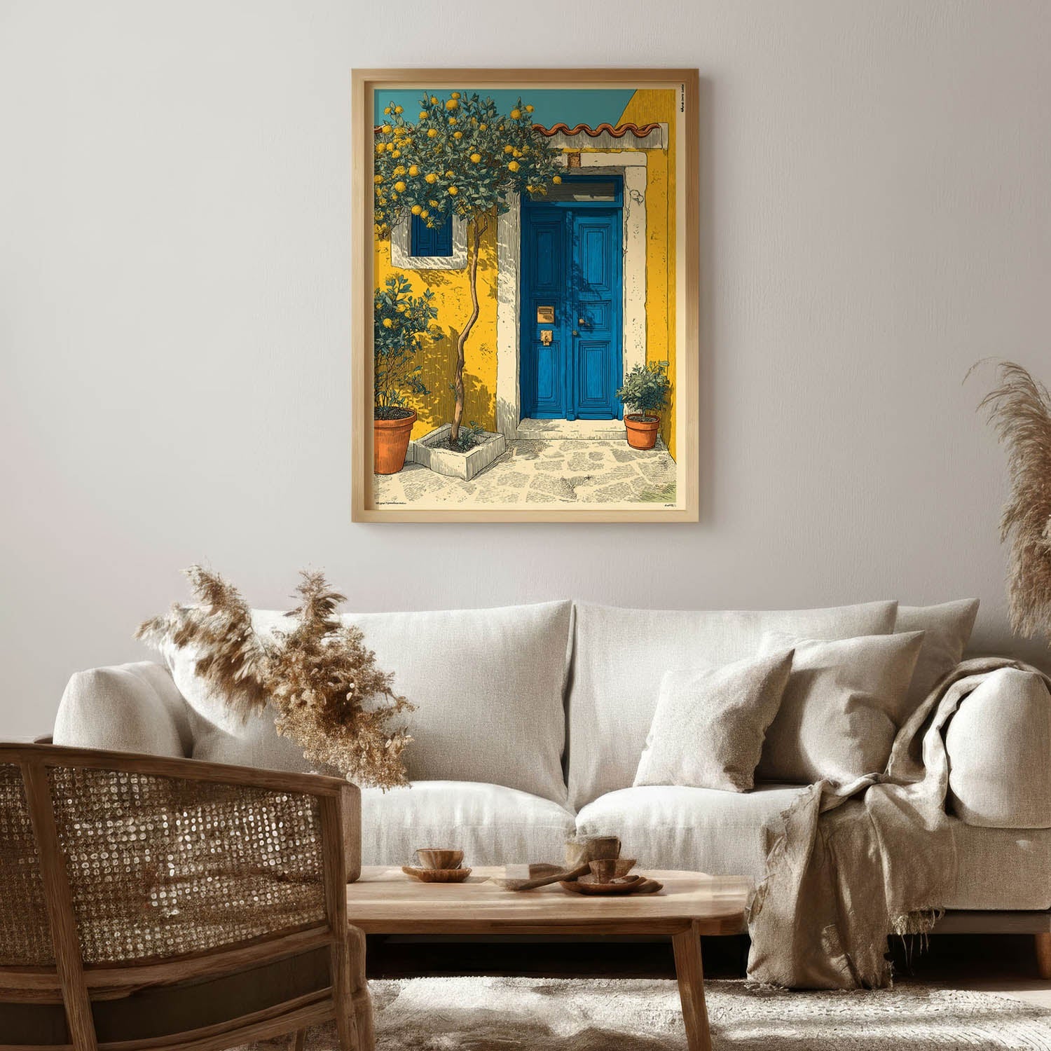 A charming architectural illustration featuring a vivid blue door framed by warm yellow walls and a flourishing lemon tree. The scene feels inviting, timeless, and full of Mediterranean warmth.