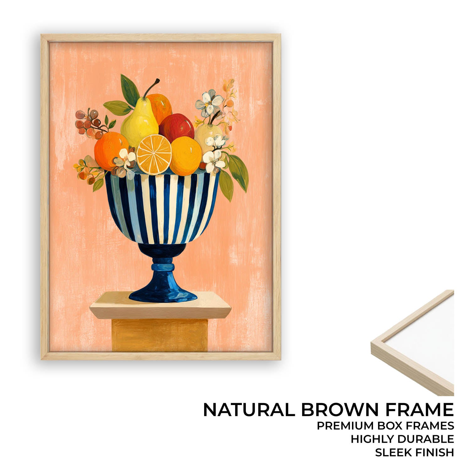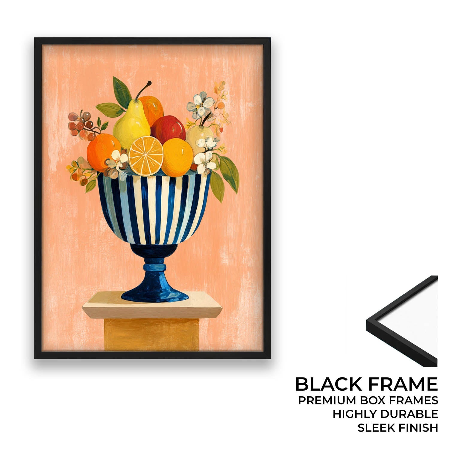 Add a fresh and lively touch with this citrus still life wall art featuring lemons, oranges, and flowers in a striped bowl. Bright colors and a simple background make it a great choice for cheerful interiors.