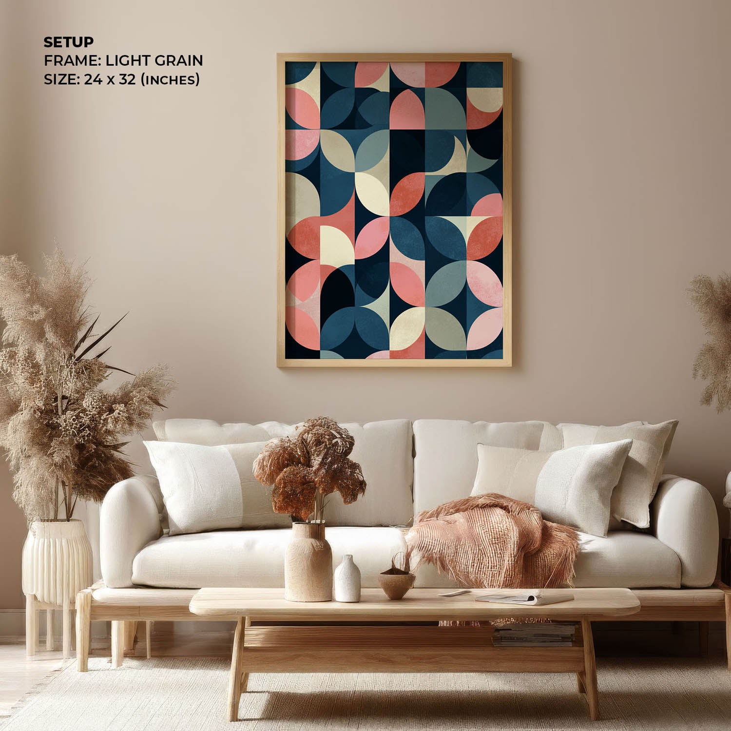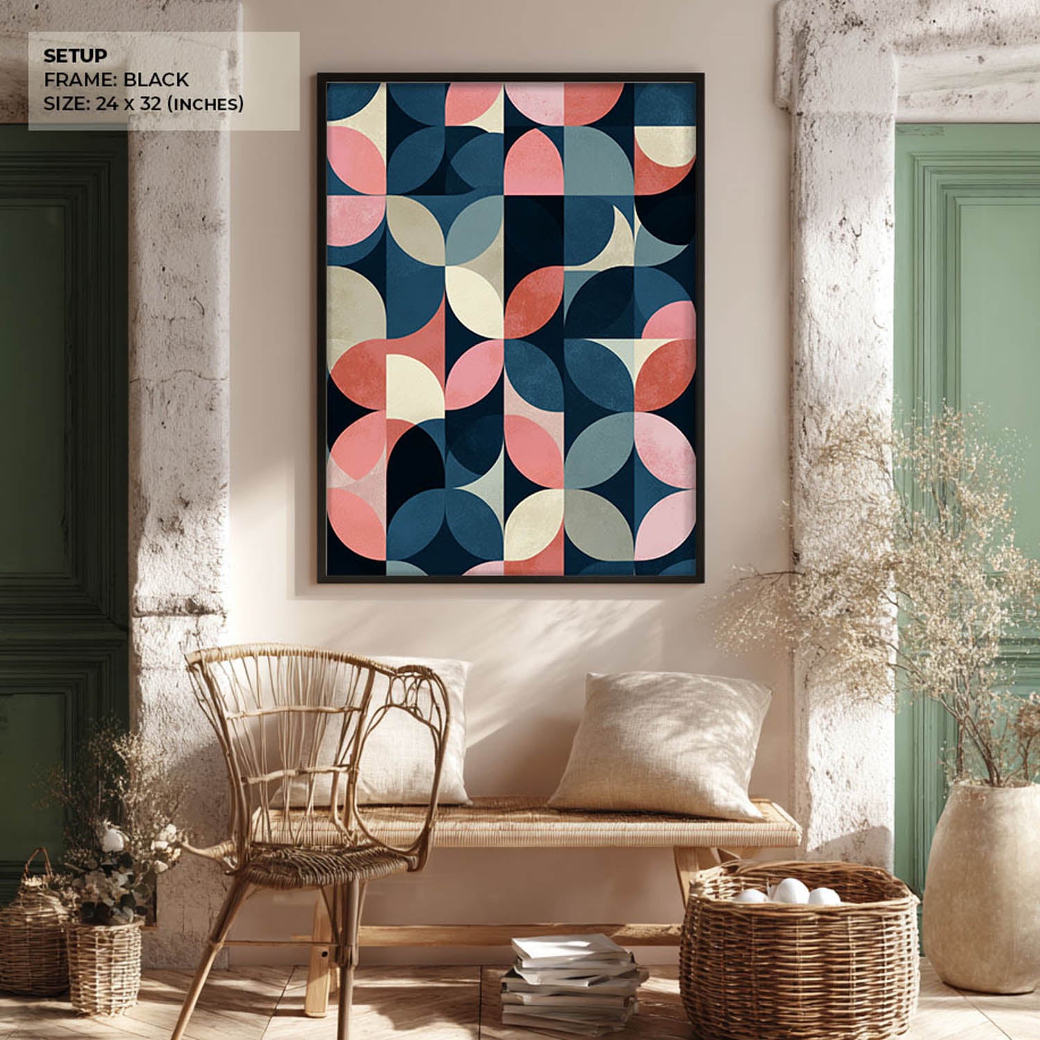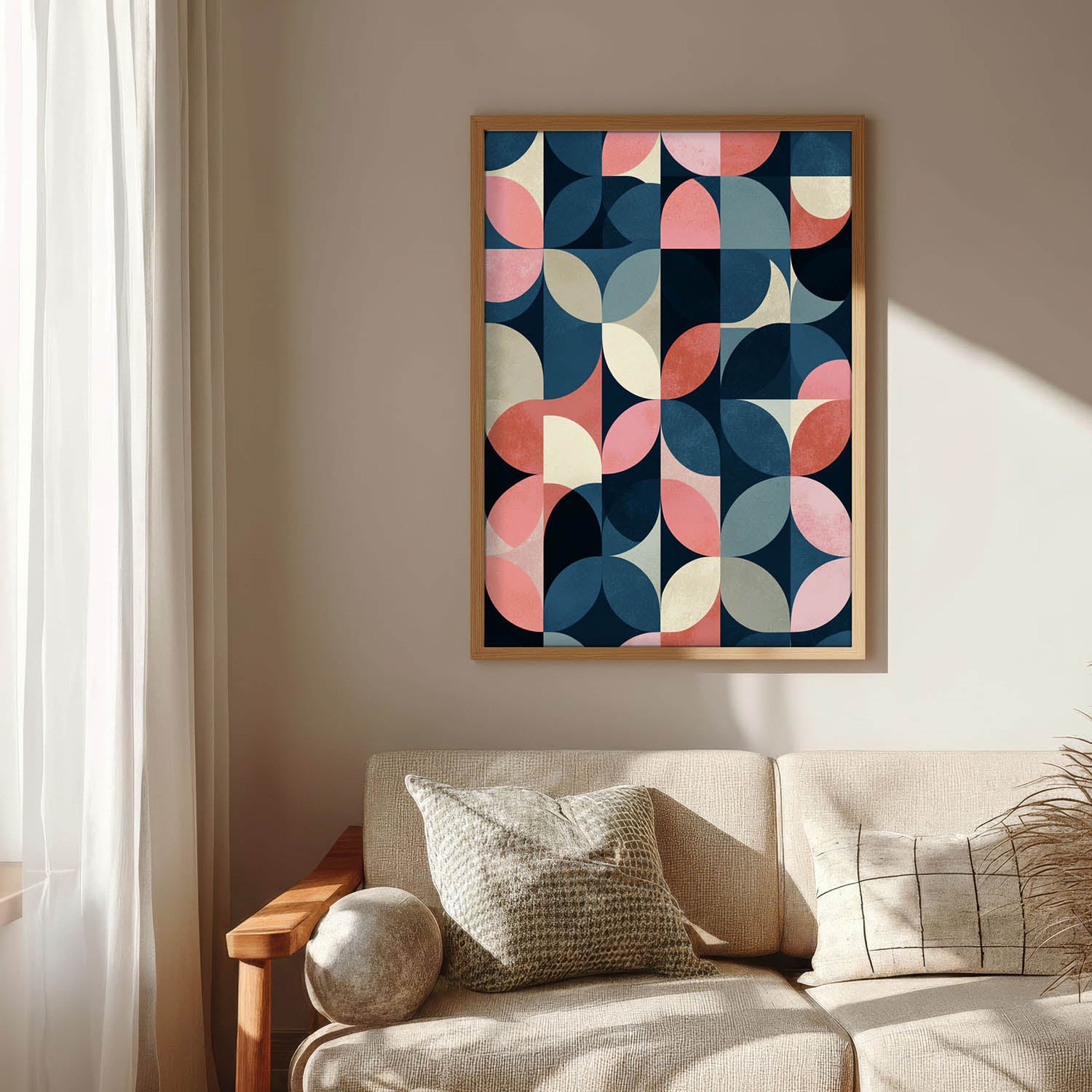This abstract composition blends curved geometric forms with layered color blocks, creating a sense of movement within structure. Muted blues, terracotta, and soft neutrals interact effortlessly, making the piece both dynamic and calming.