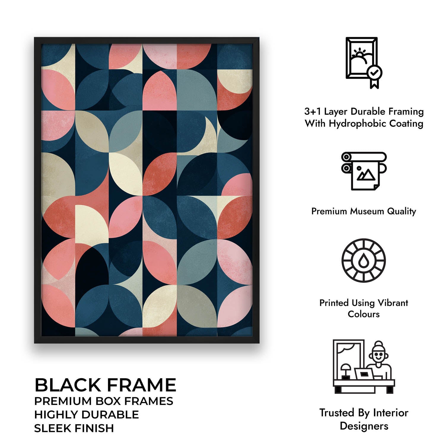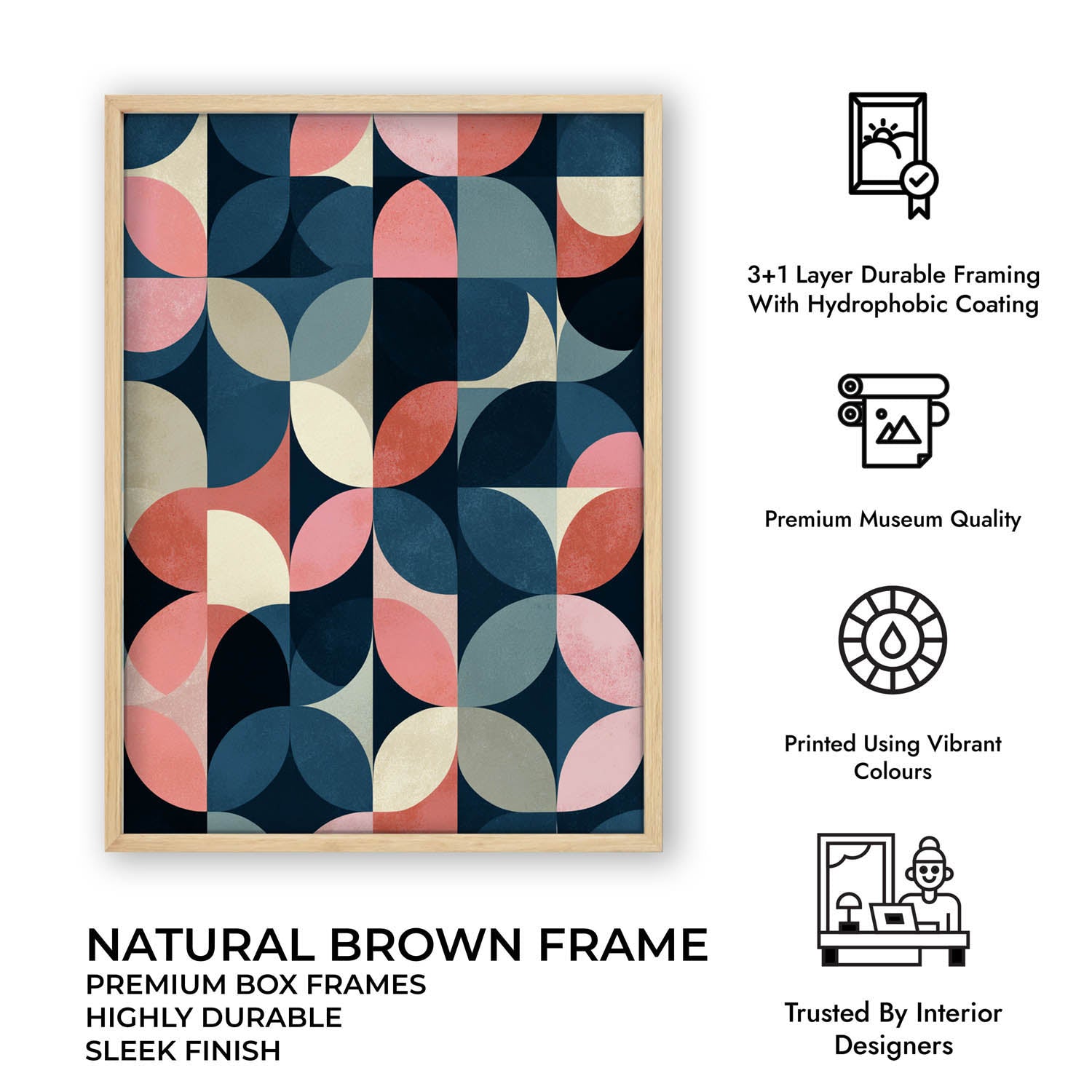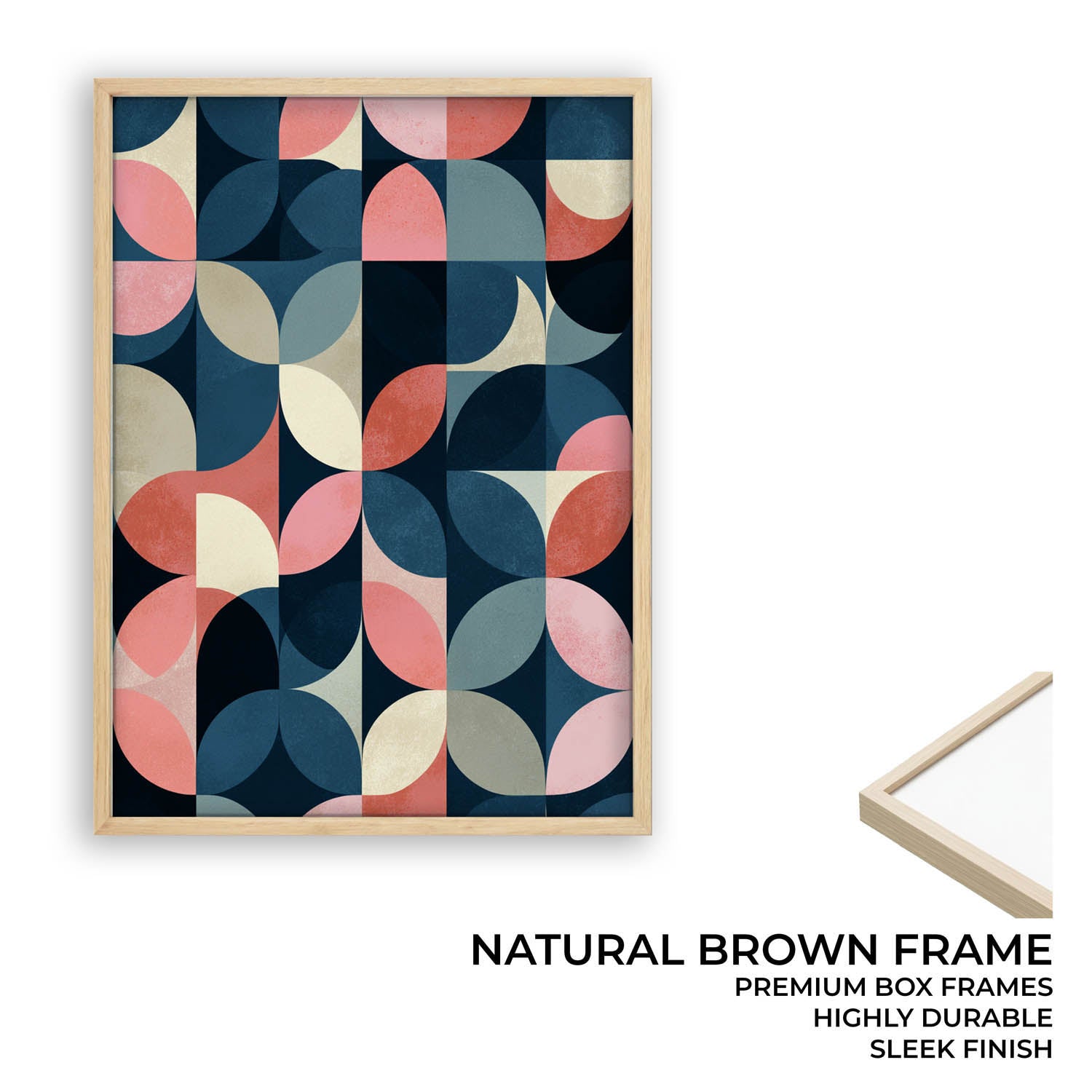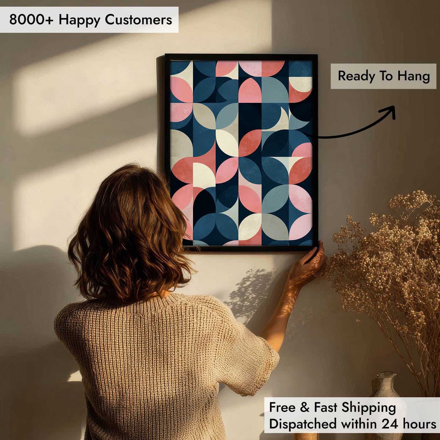 This abstract composition blends curved geometric forms with layered color blocks, creating a sense of movement within structure. Muted blues, terracotta, and soft neutrals interact effortlessly, making the piece both dynamic and calming.
