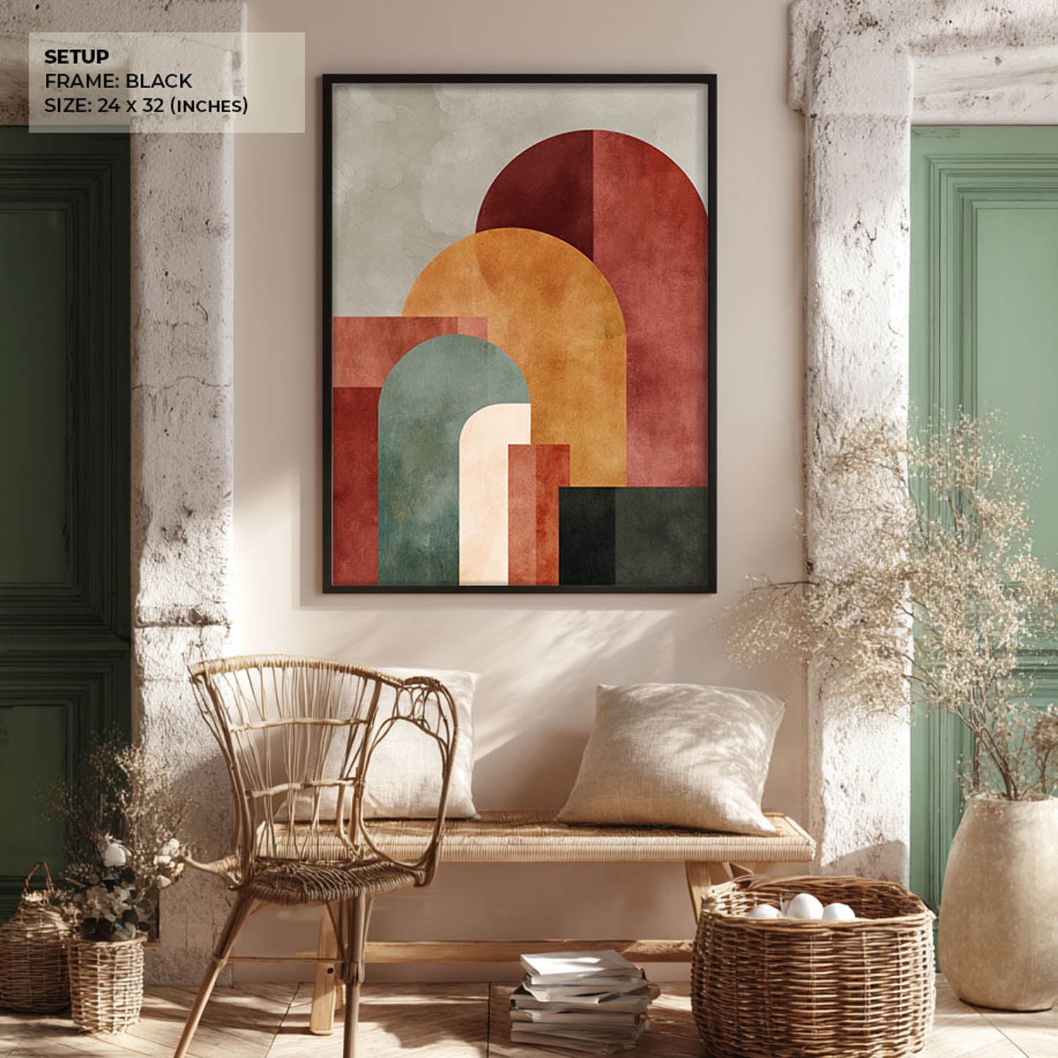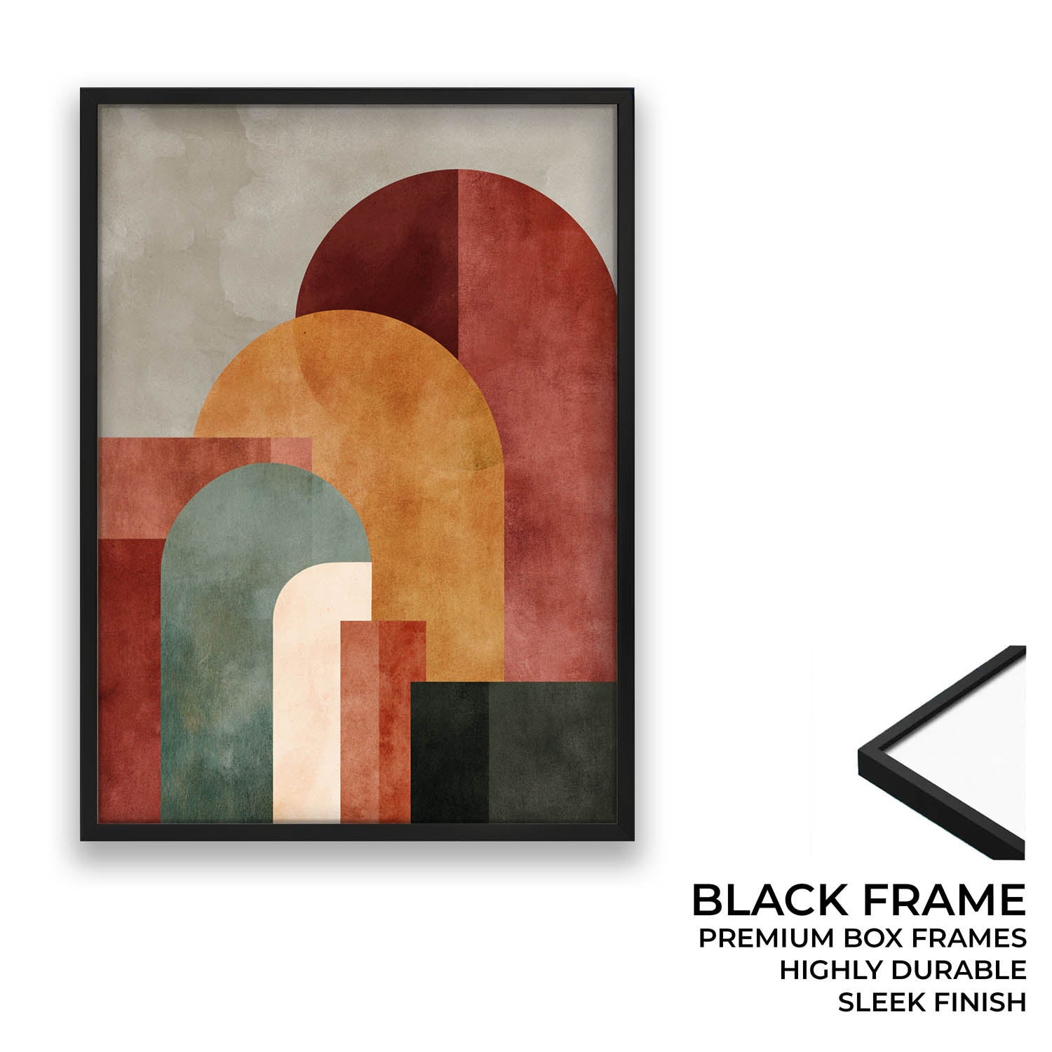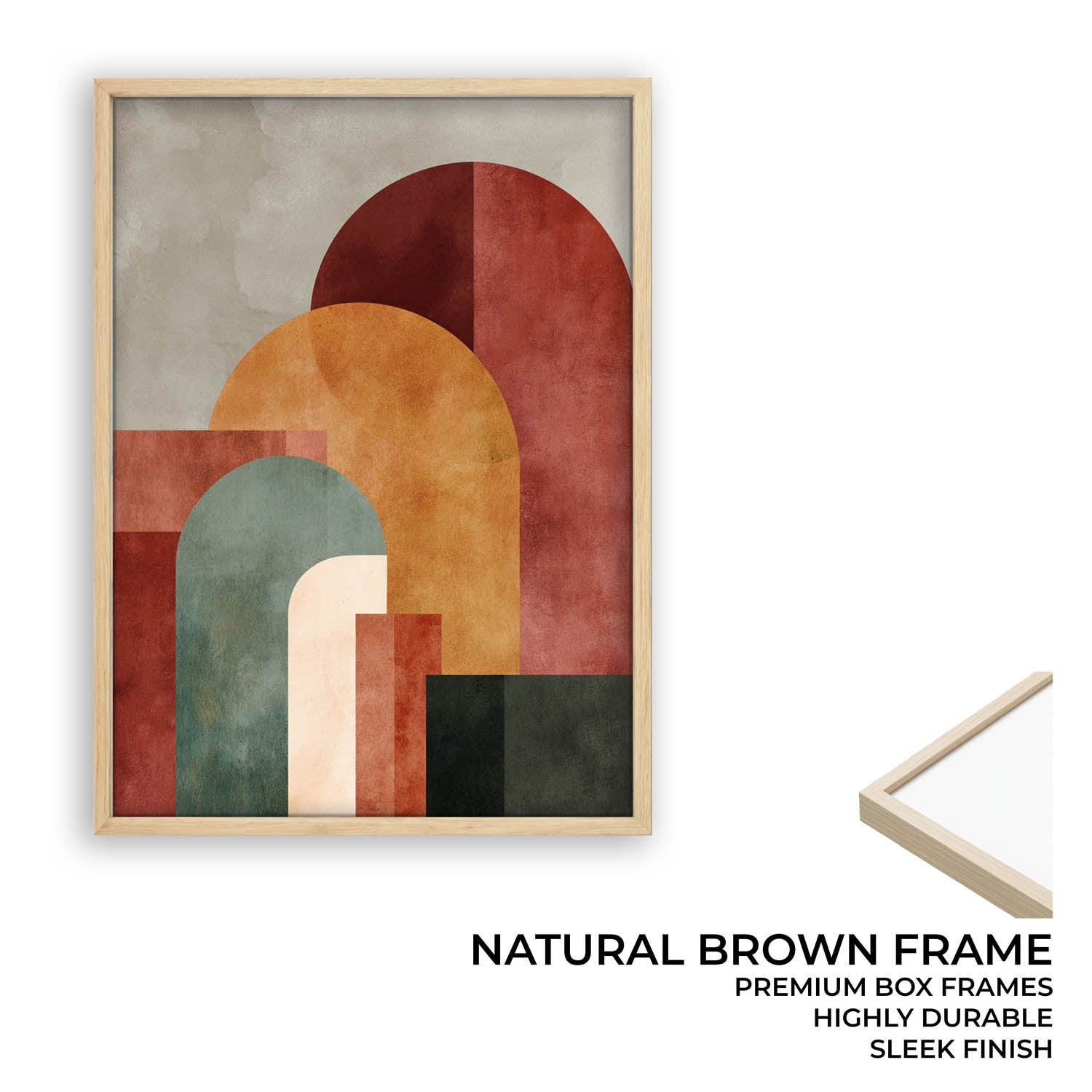 This artwork explores balance through layered geometric forms and muted earthy tones. Soft arches, overlapping blocks, and textured surfaces come together to create a composition that feels grounded yet modern. The palette of rust, clay, olive, and warm neutrals makes it calm to look at, while the structure keeps it visually engaging.