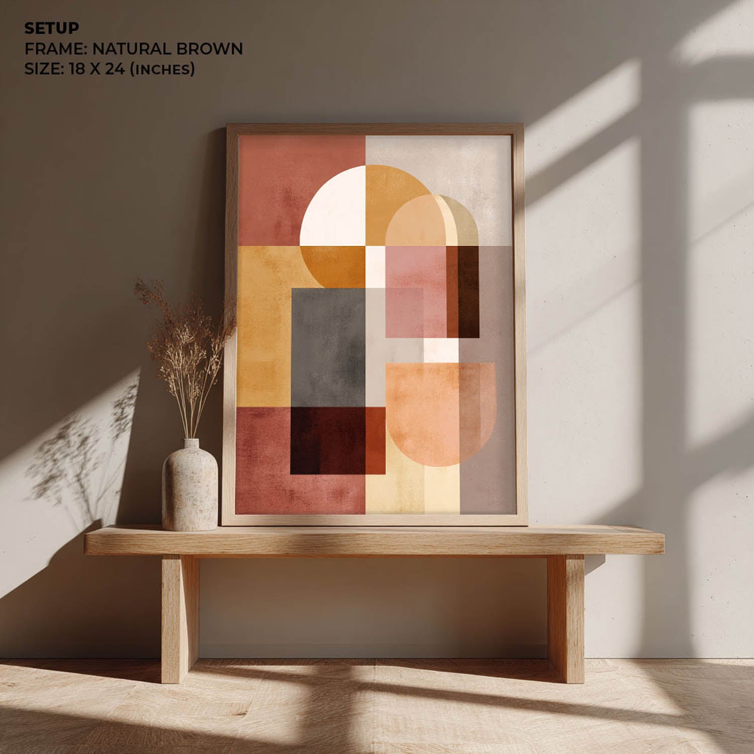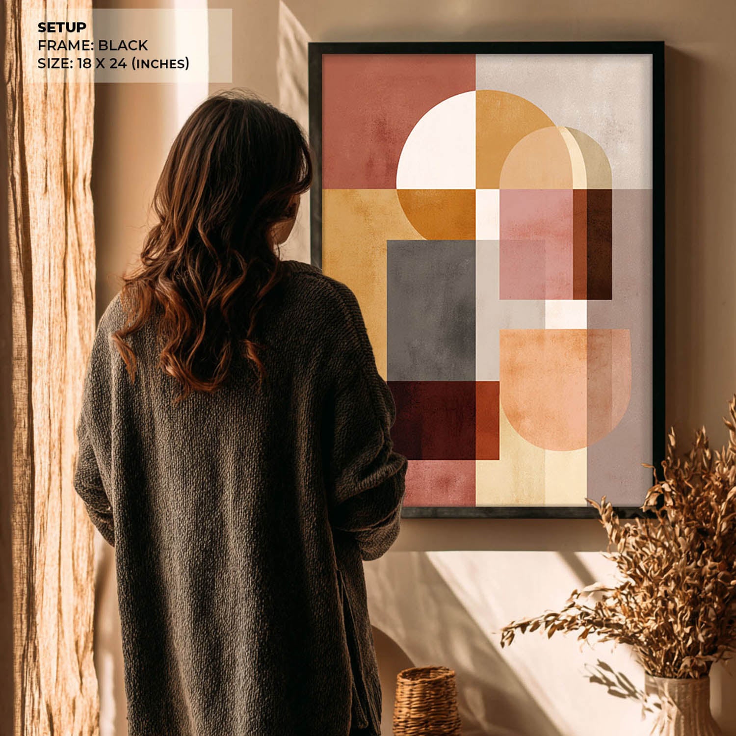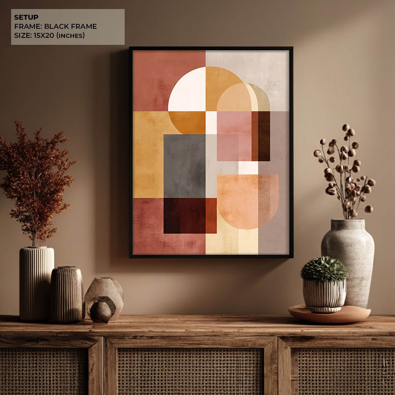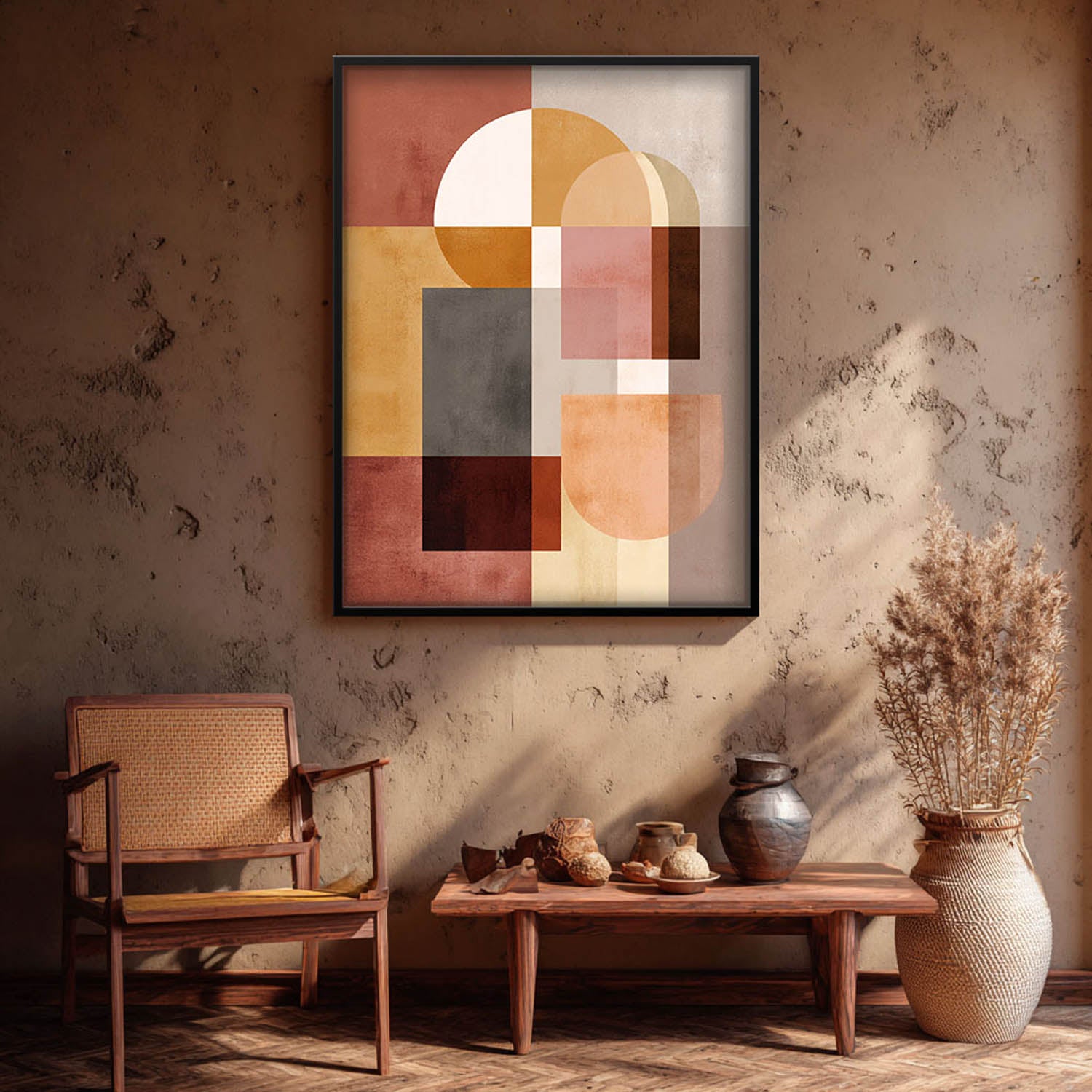 This piece brings together circles, arches, and blocks in a layered arrangement that feels intuitive and fluid. The overlapping forms and gentle color transitions create depth without sharp contrast, making it easy to pair with neutral or earthy interiors.