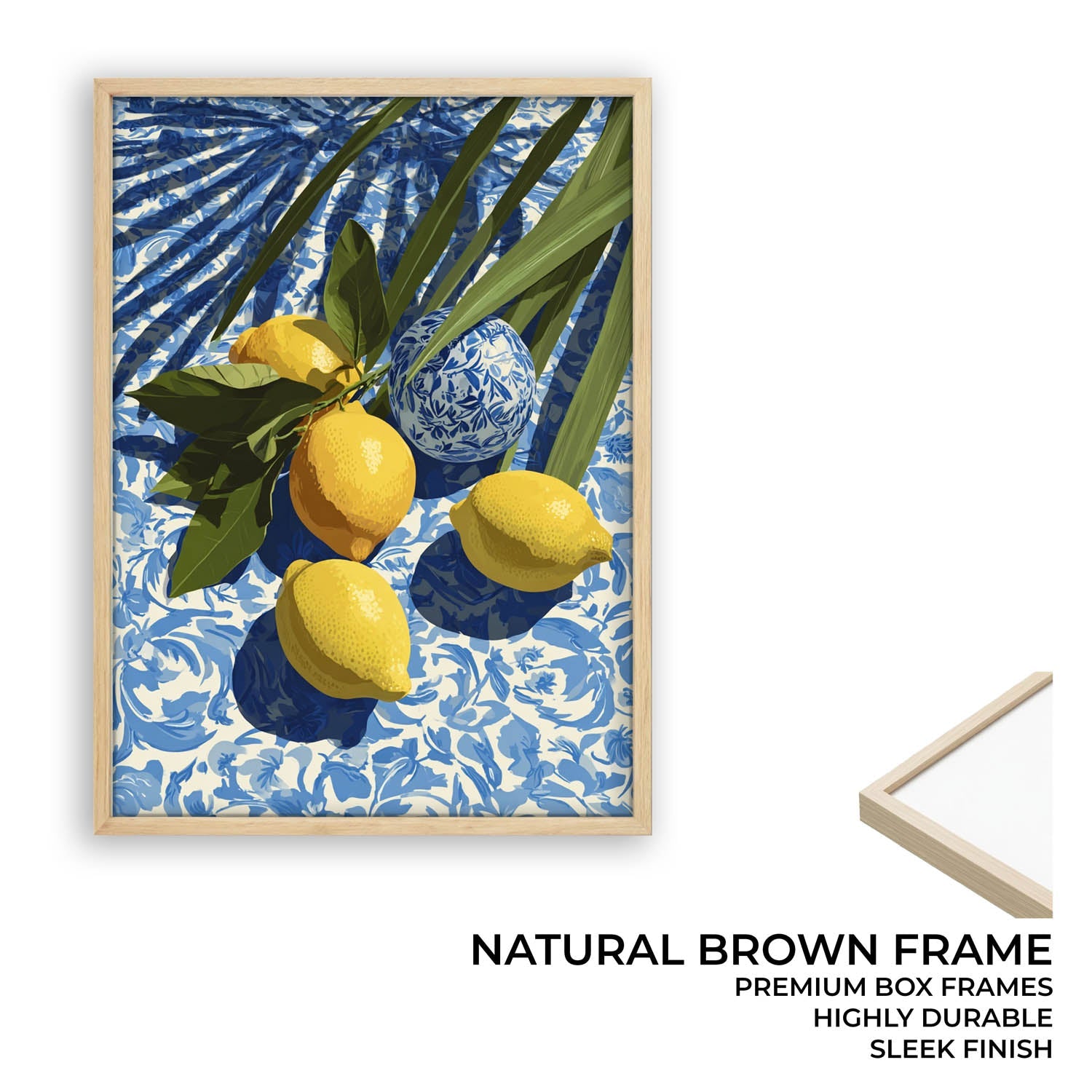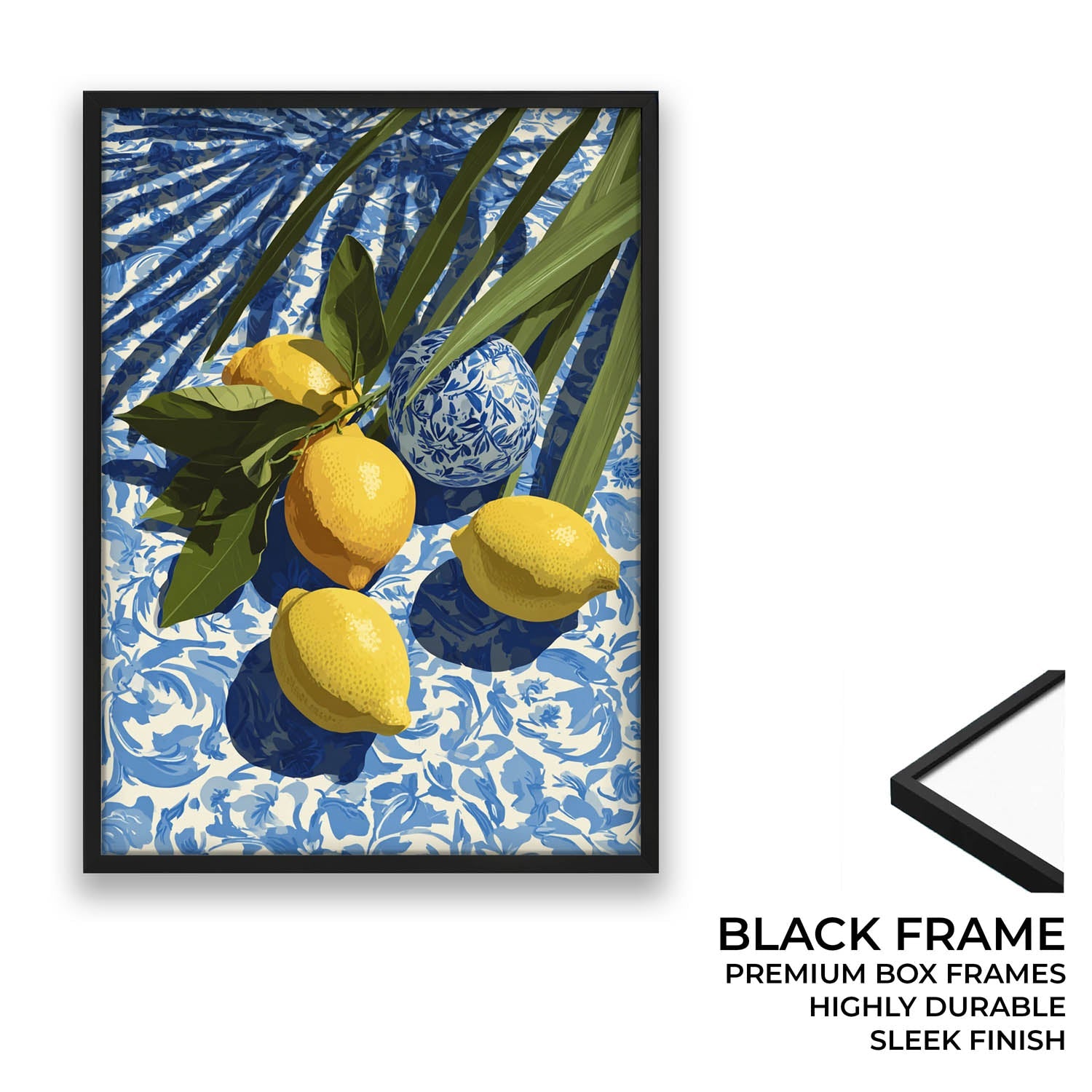 This Mediterranean-inspired wall art features sun-ripened lemons resting on blue-and-white patterned fabric, accented with lush green leaves and soft shadows for a fresh, relaxed coastal feel.