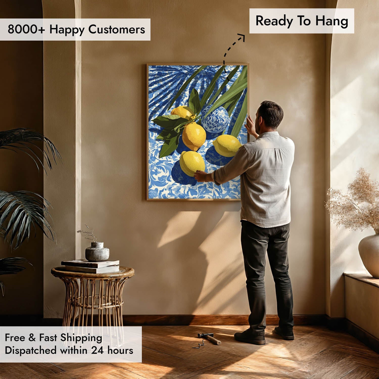 Designed to brighten your space without feeling busy, this artwork brings warmth, calm, and effortless style. A timeless piece inspired by sunlit tables, coastal homes, and slow Mediterranean living.