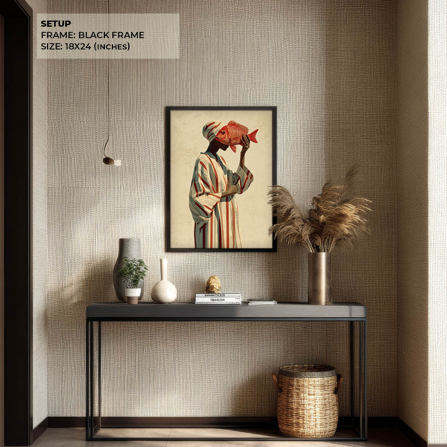 This bold and artistic wall print features a surreal portrait combining fashion and marine elements. The unique concept and earthy tones make it a striking statement piece.