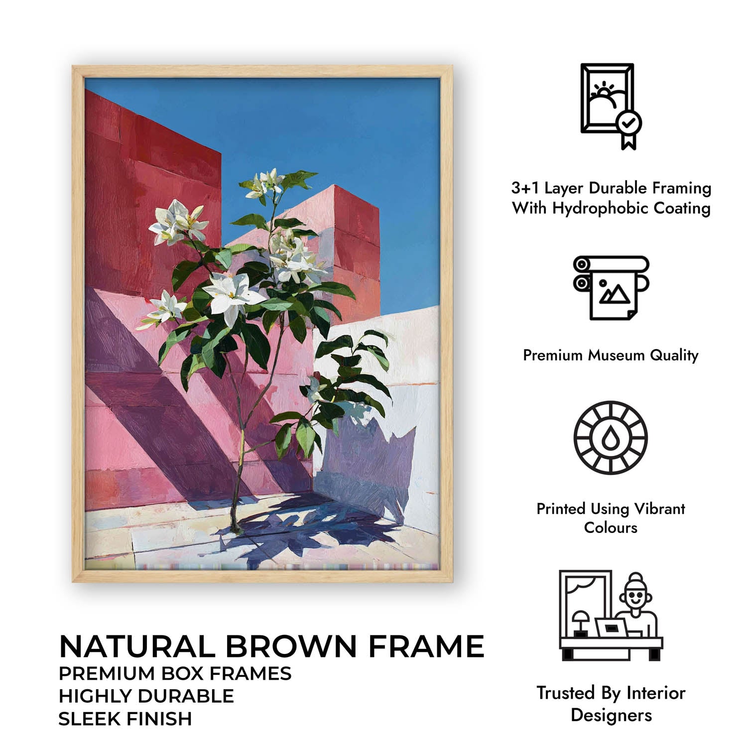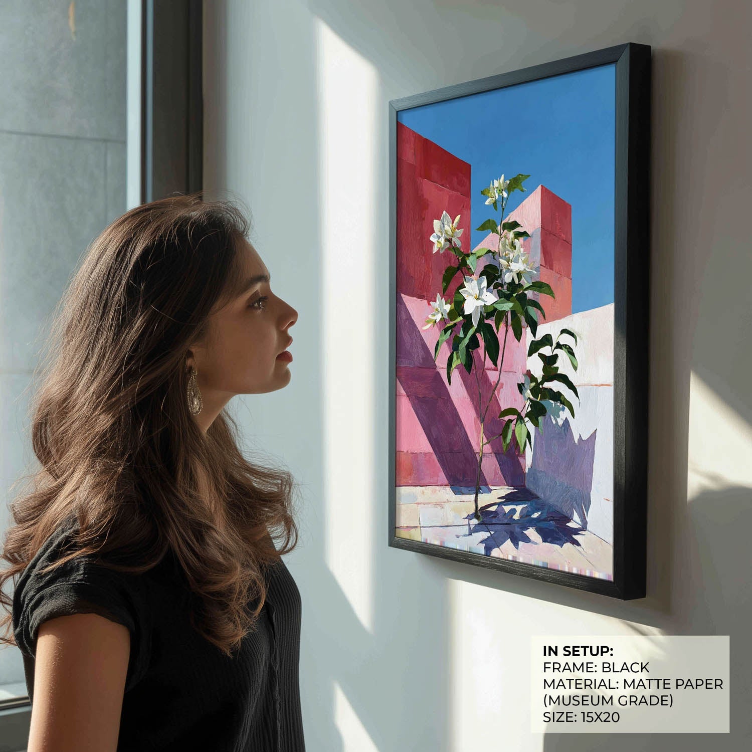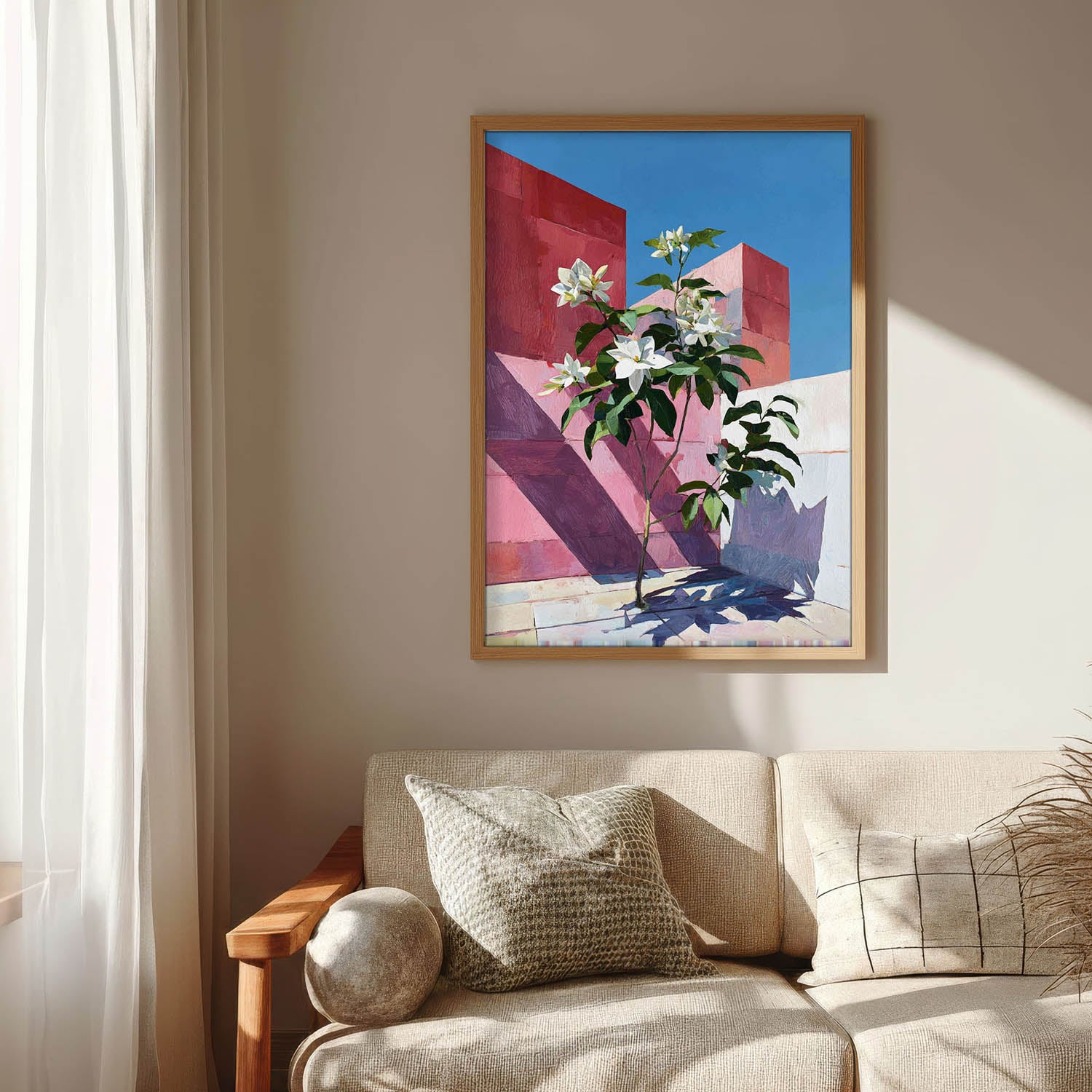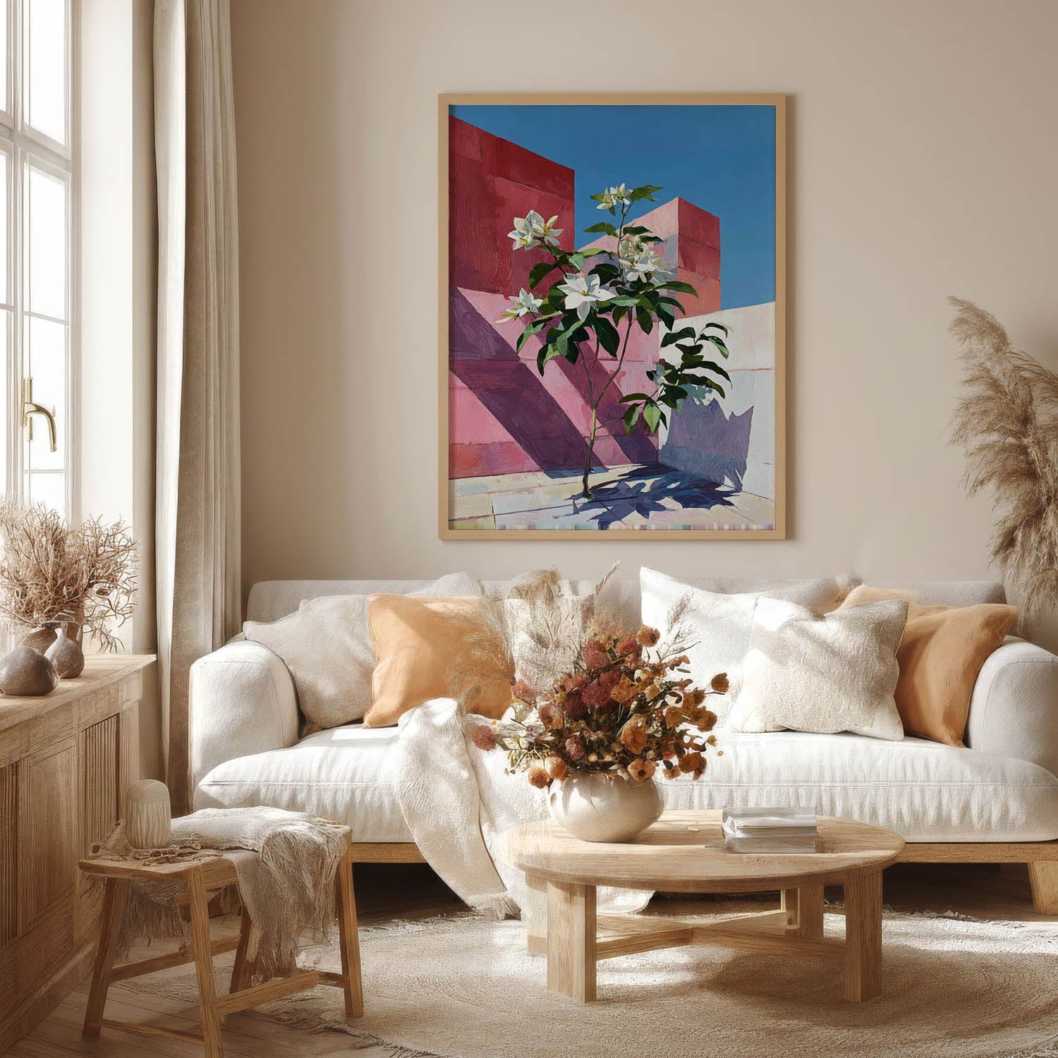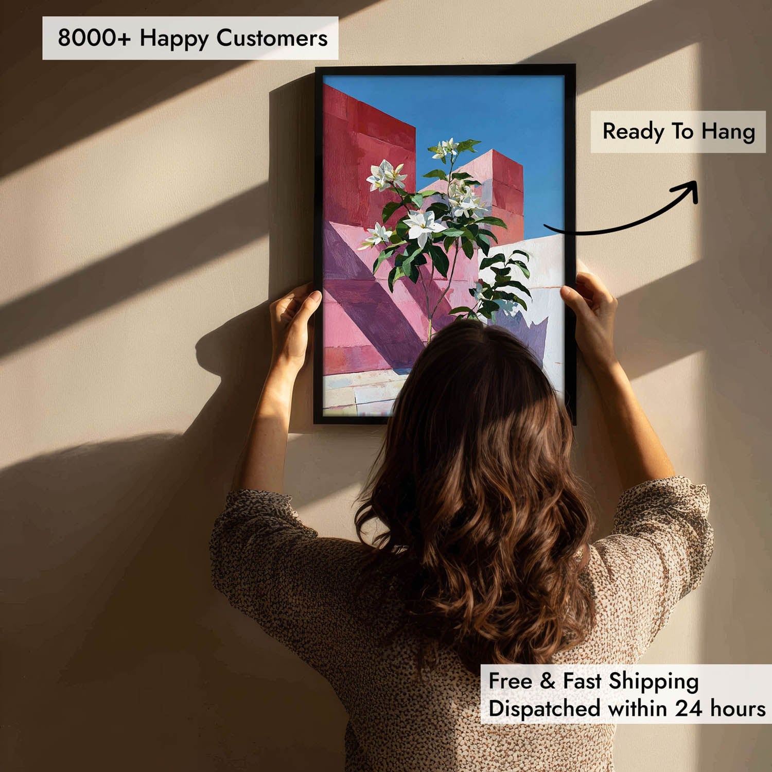 Bring calm balance and modern elegance to your space with this botanical wall art. Featuring delicate white flowers and green leaves set against soft pink architectural forms and a clear blue sky, this artwork blends nature with clean, geometric design.